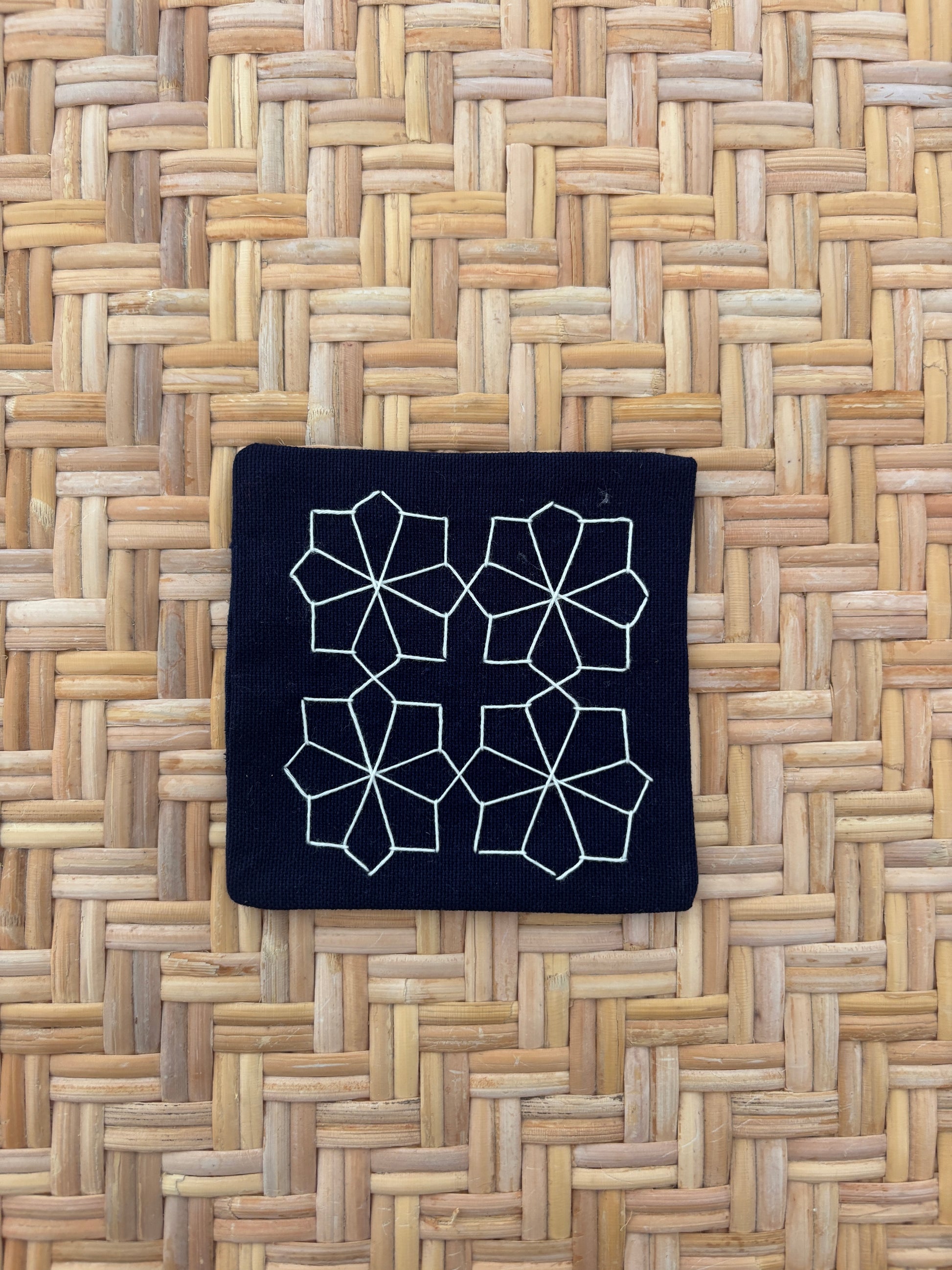 Coaster er håndbroderet med den japanske sashikoteknik af bomuldsgarn på 100% økocertificetet bomuldsstof.