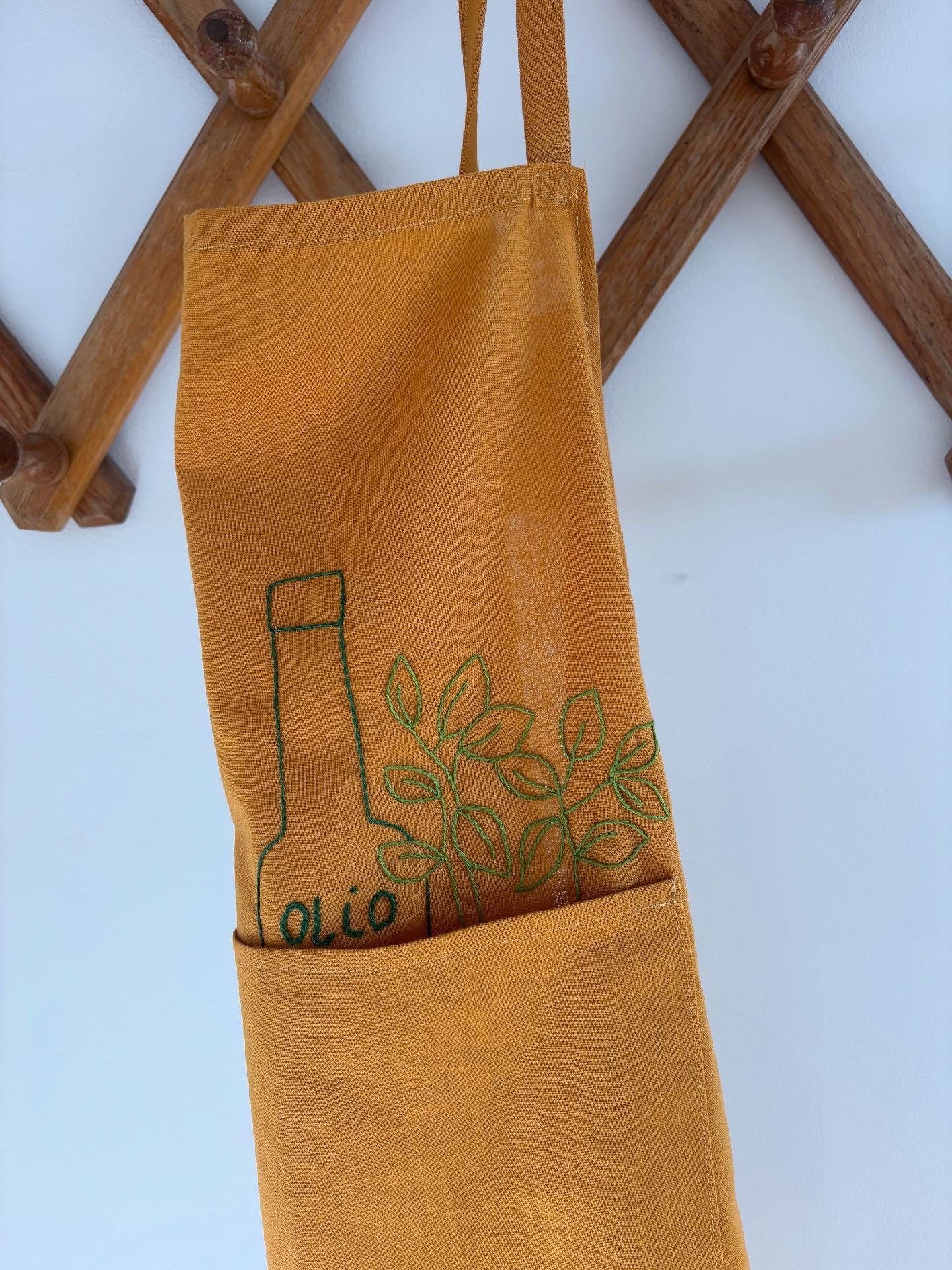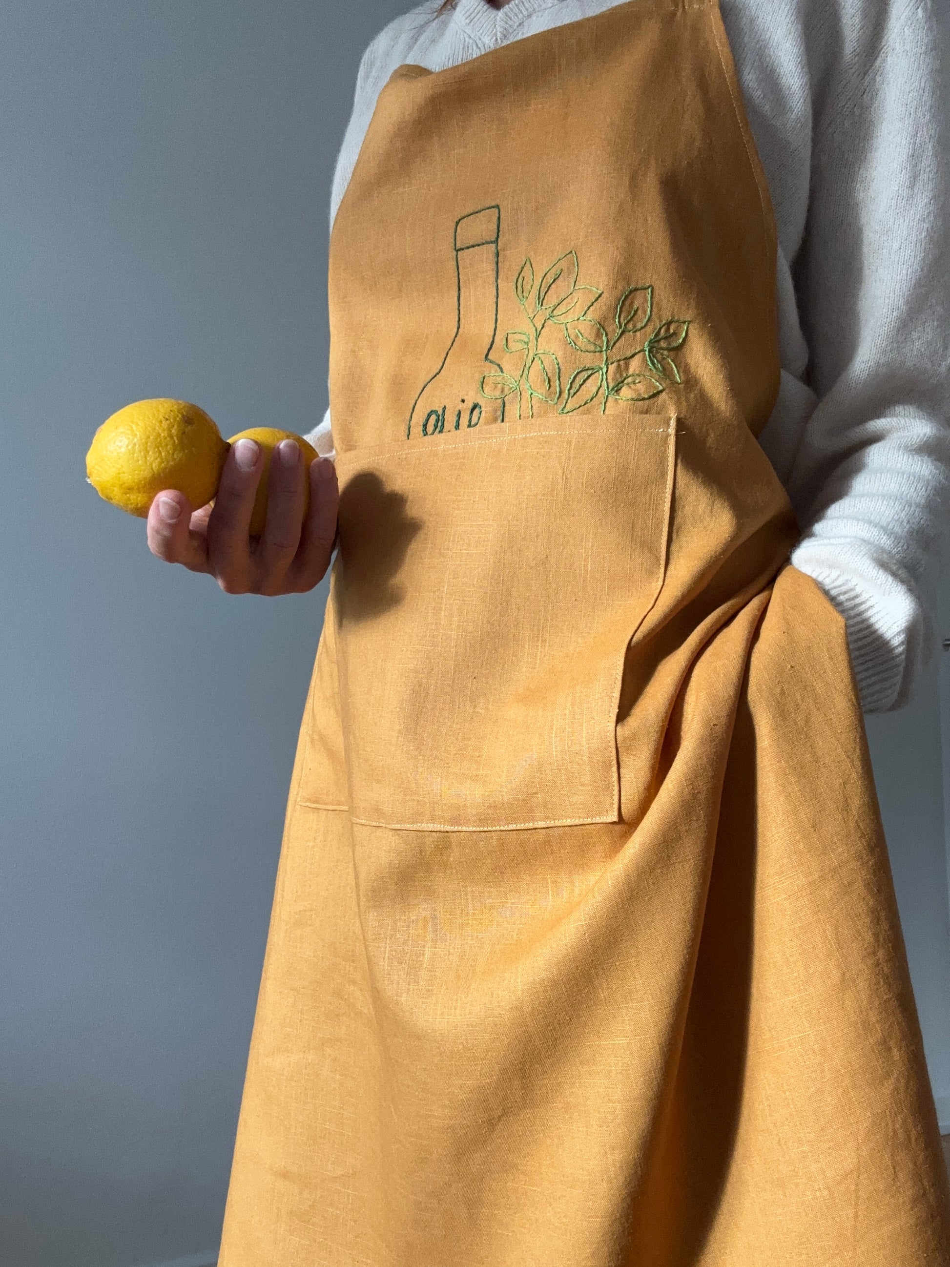 Forklæde i 100 % hær med frihåndsbroderet olie og basilikum