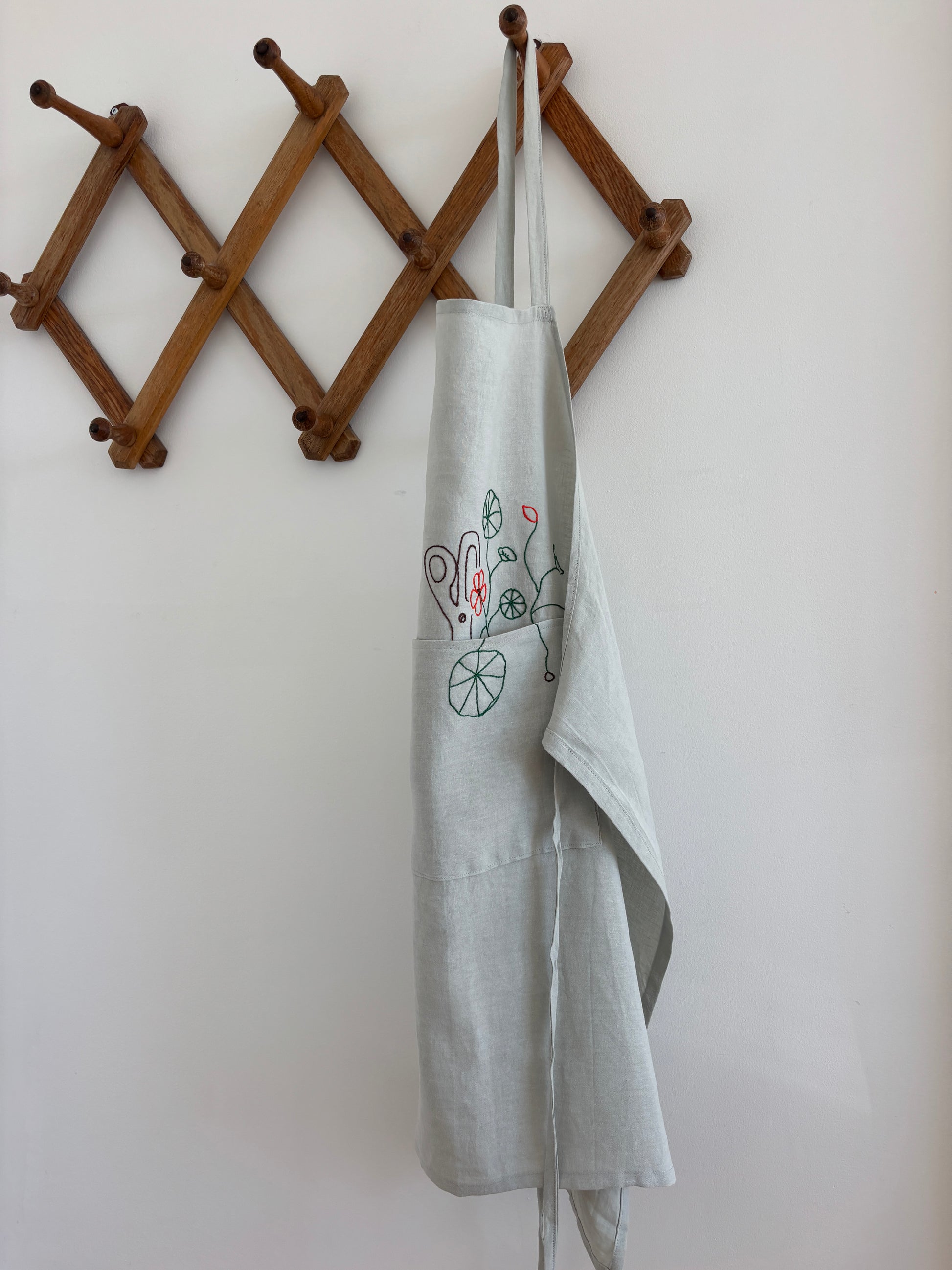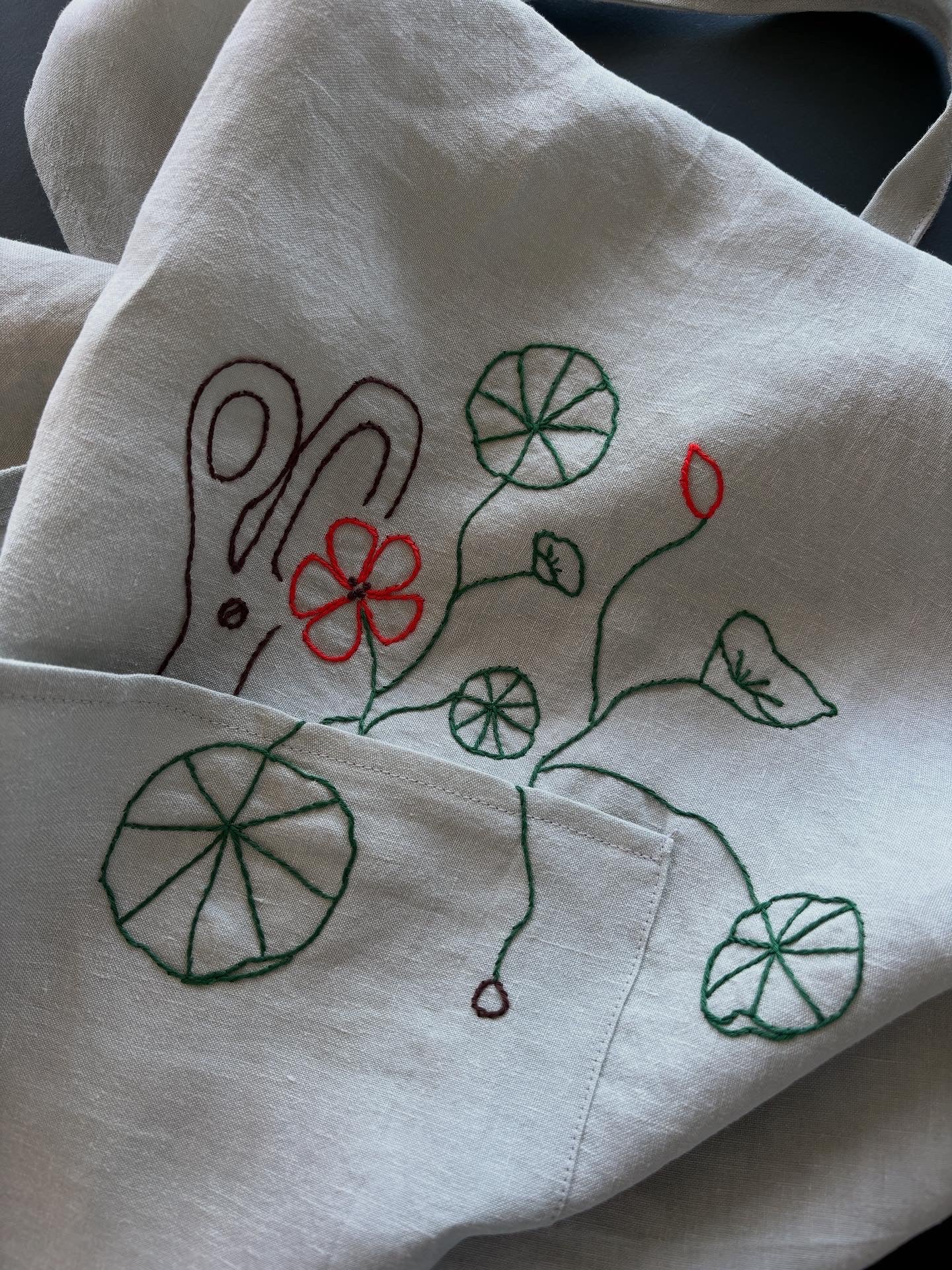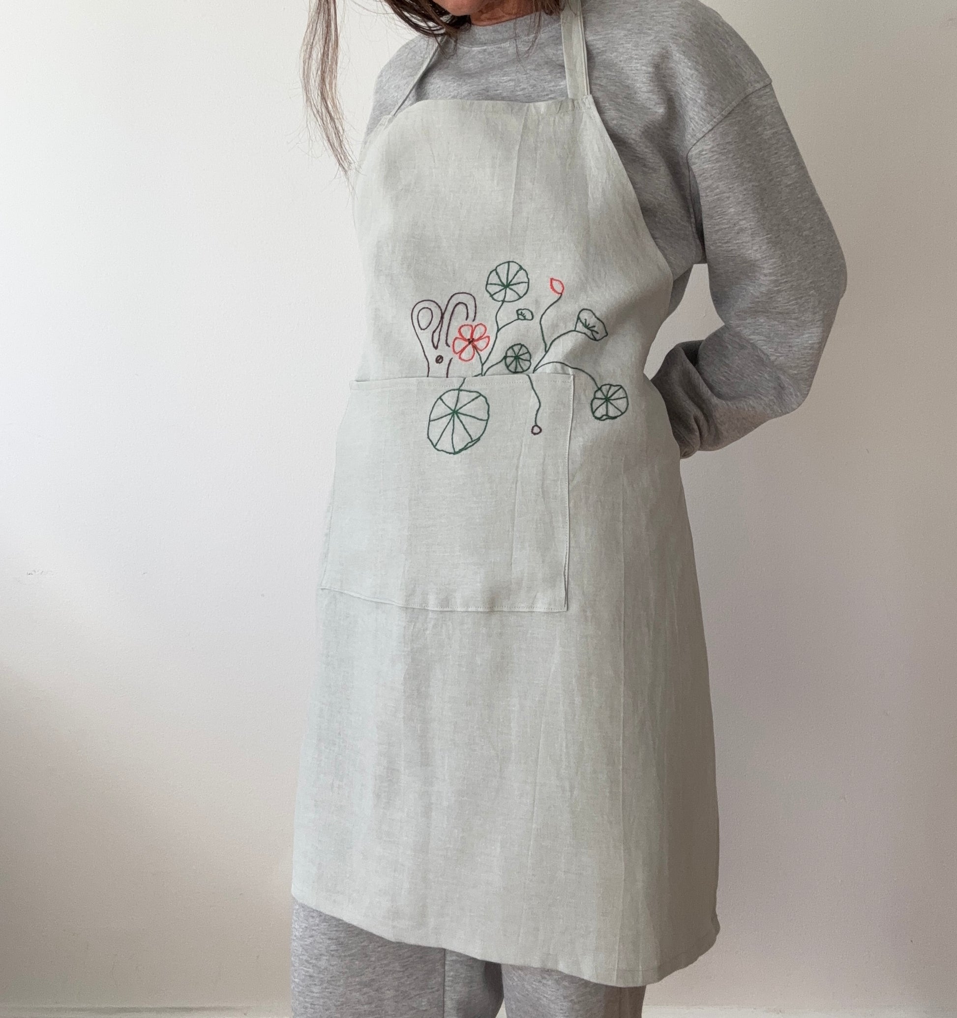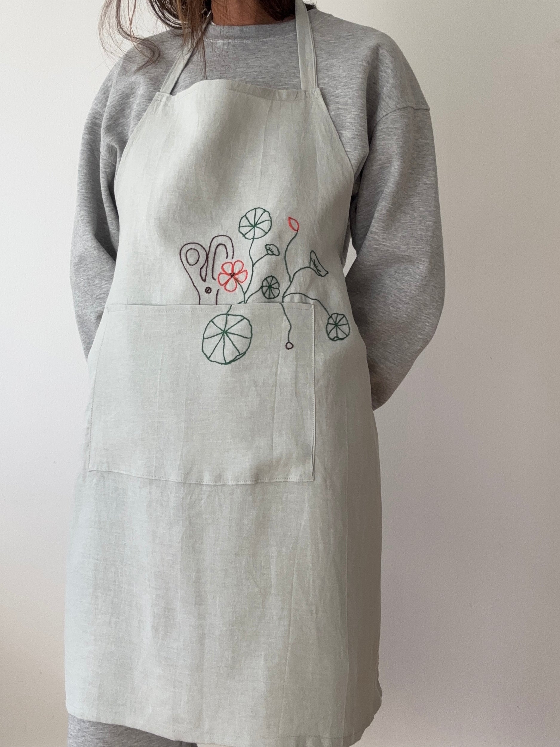 Forklæde i 100 % hør med frihåndsbroderede tallerkensmækker og saks