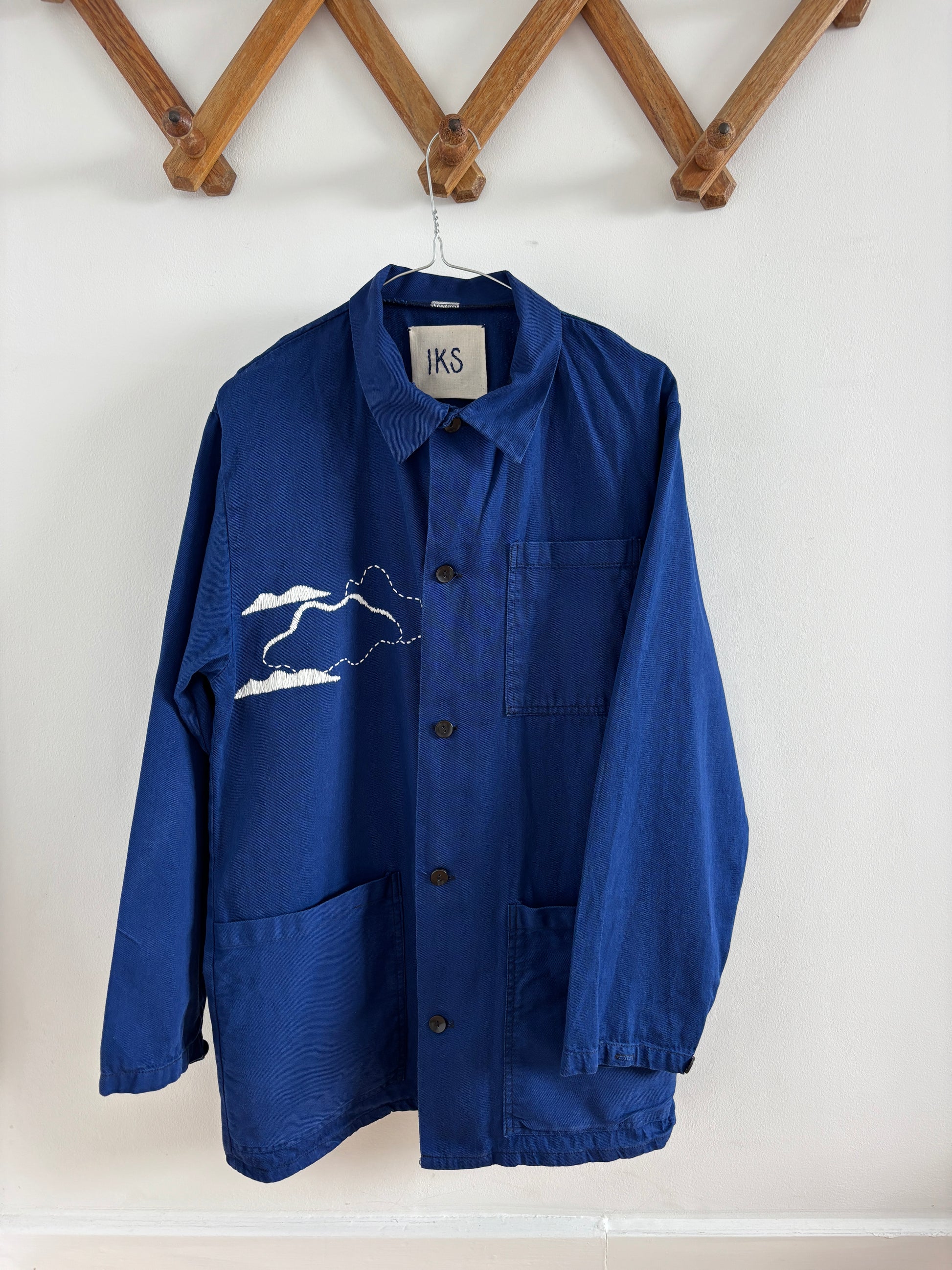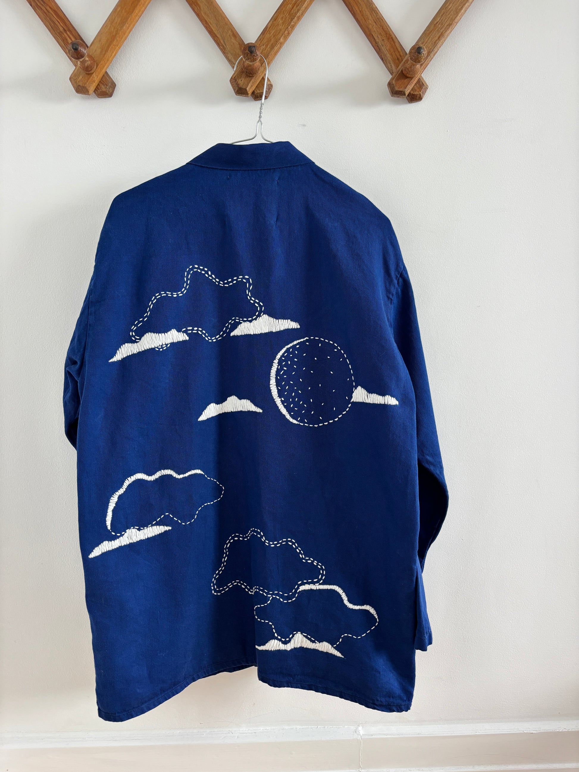 Brugt arbejdsjakke med frihåndsbroderede skyer