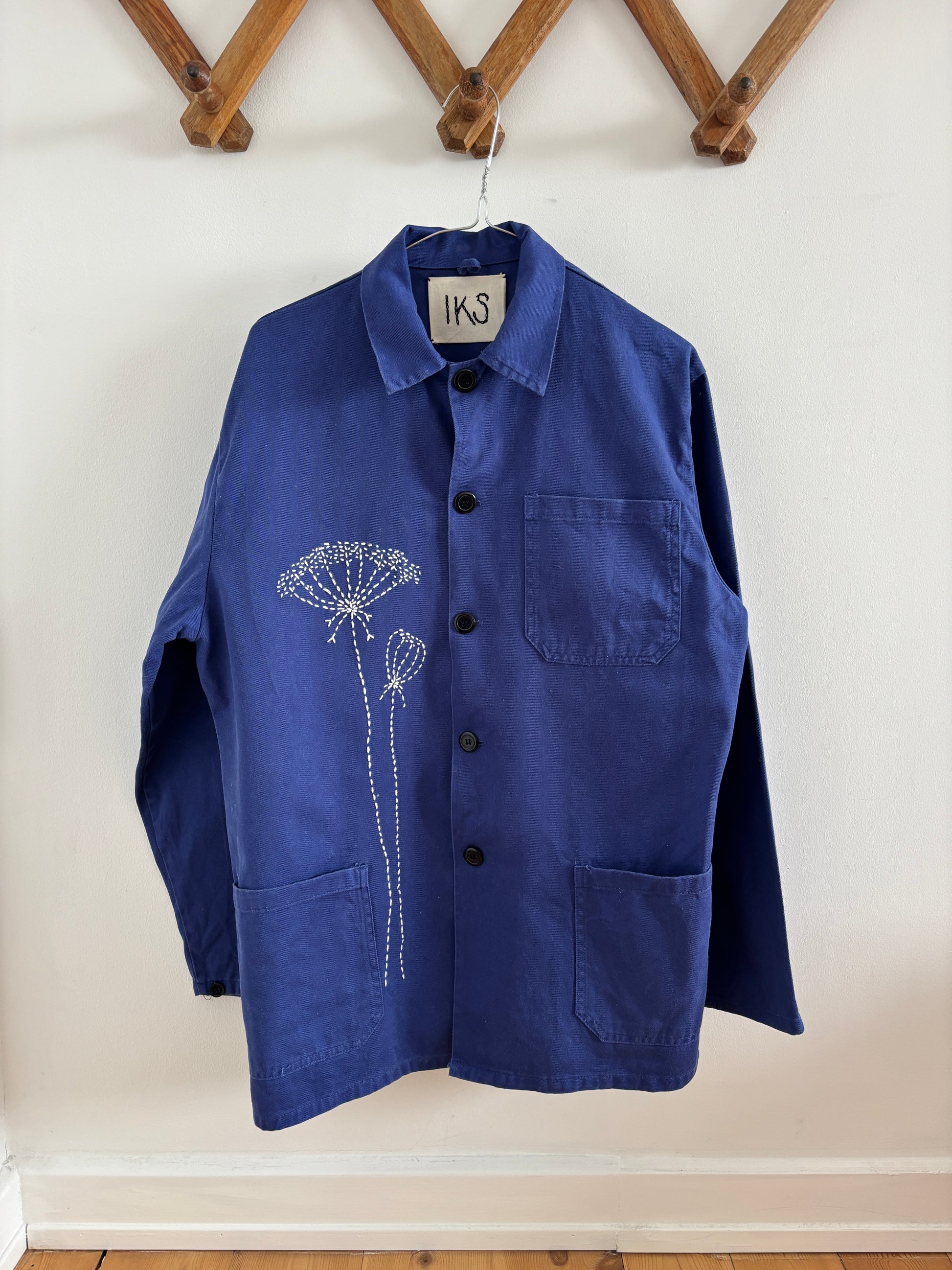 Brugt arbejdsjakke med frihåndsbroderet vild gulerod