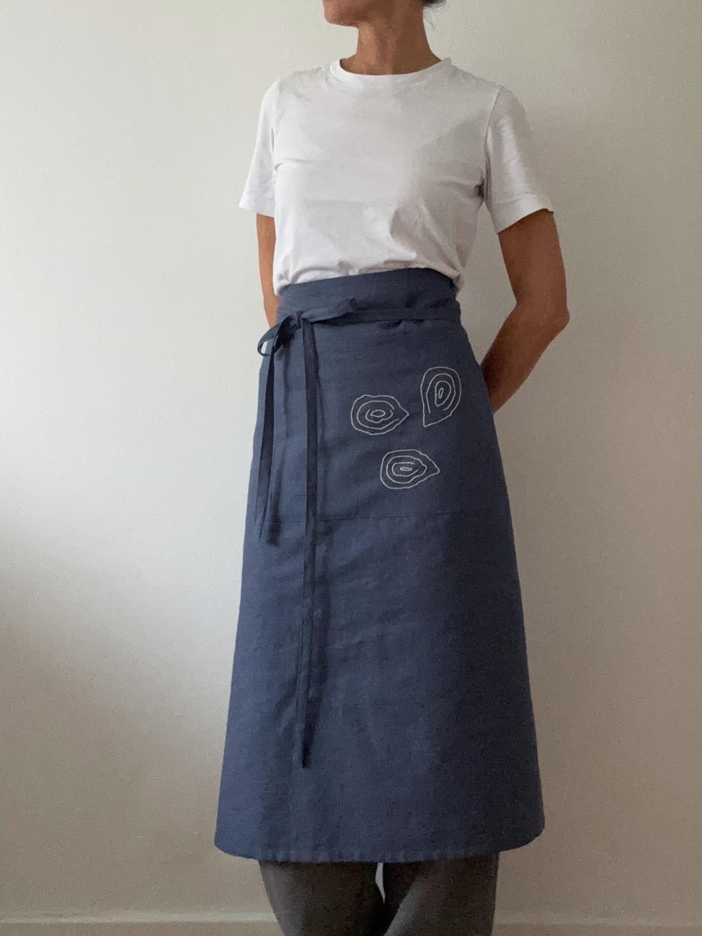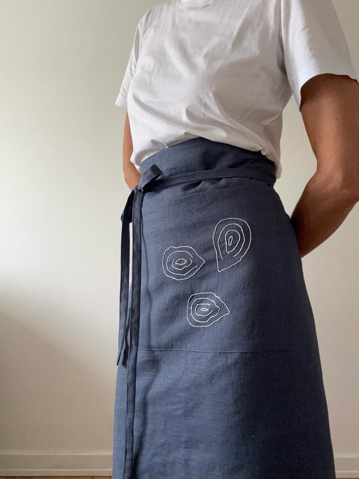 Kokkeforstykke i 80% hør og 20% bomuld med frihåndsbroderede østers