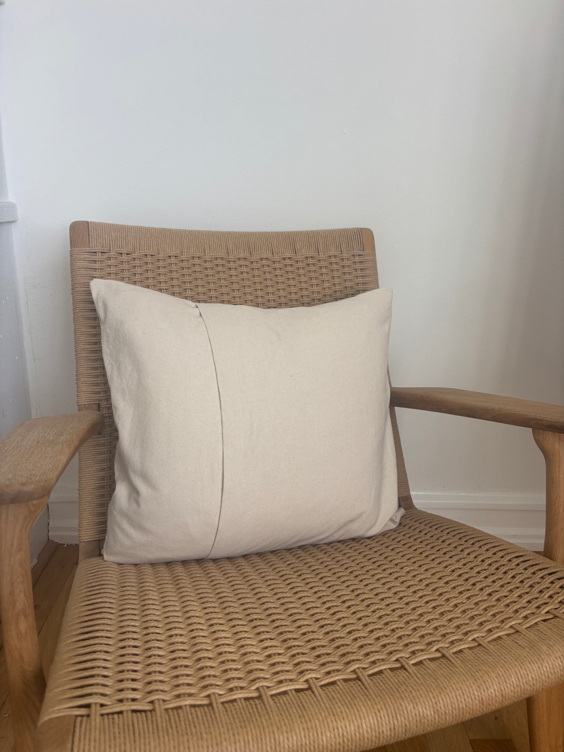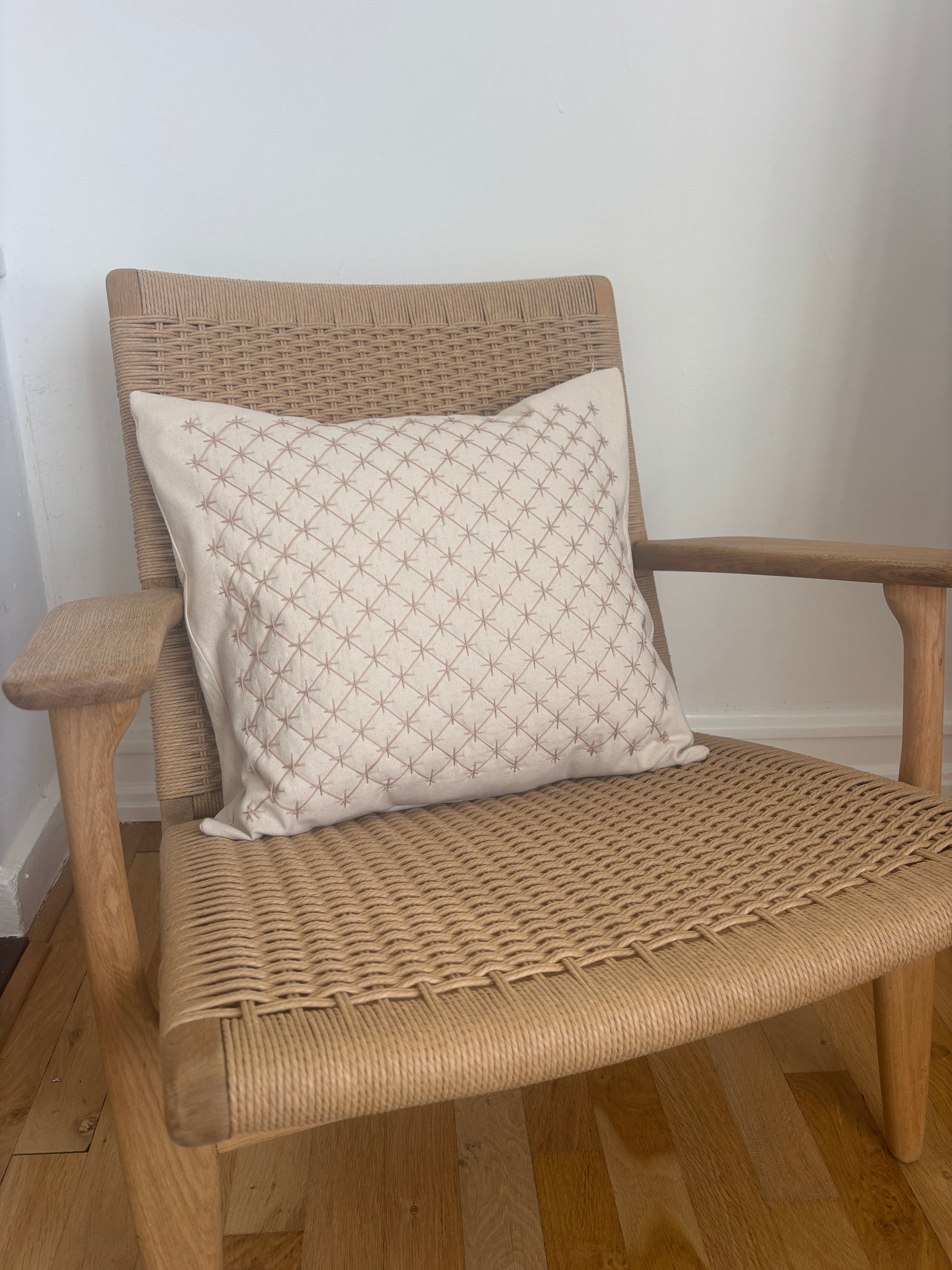 Pude i 100% kraftigt bomuldsstof med håndbroderet sashikomønster. Inderpude af dun medfølger.