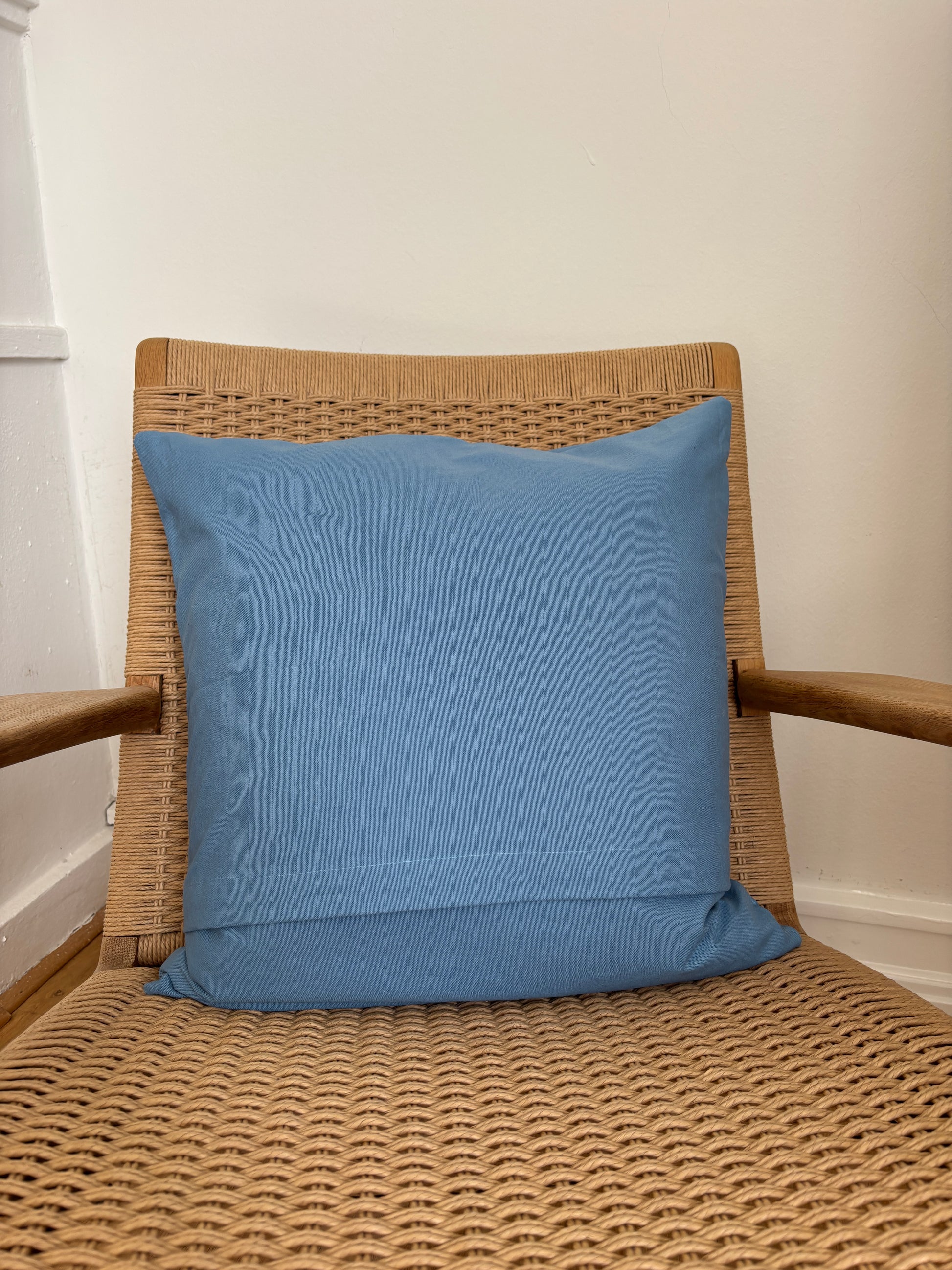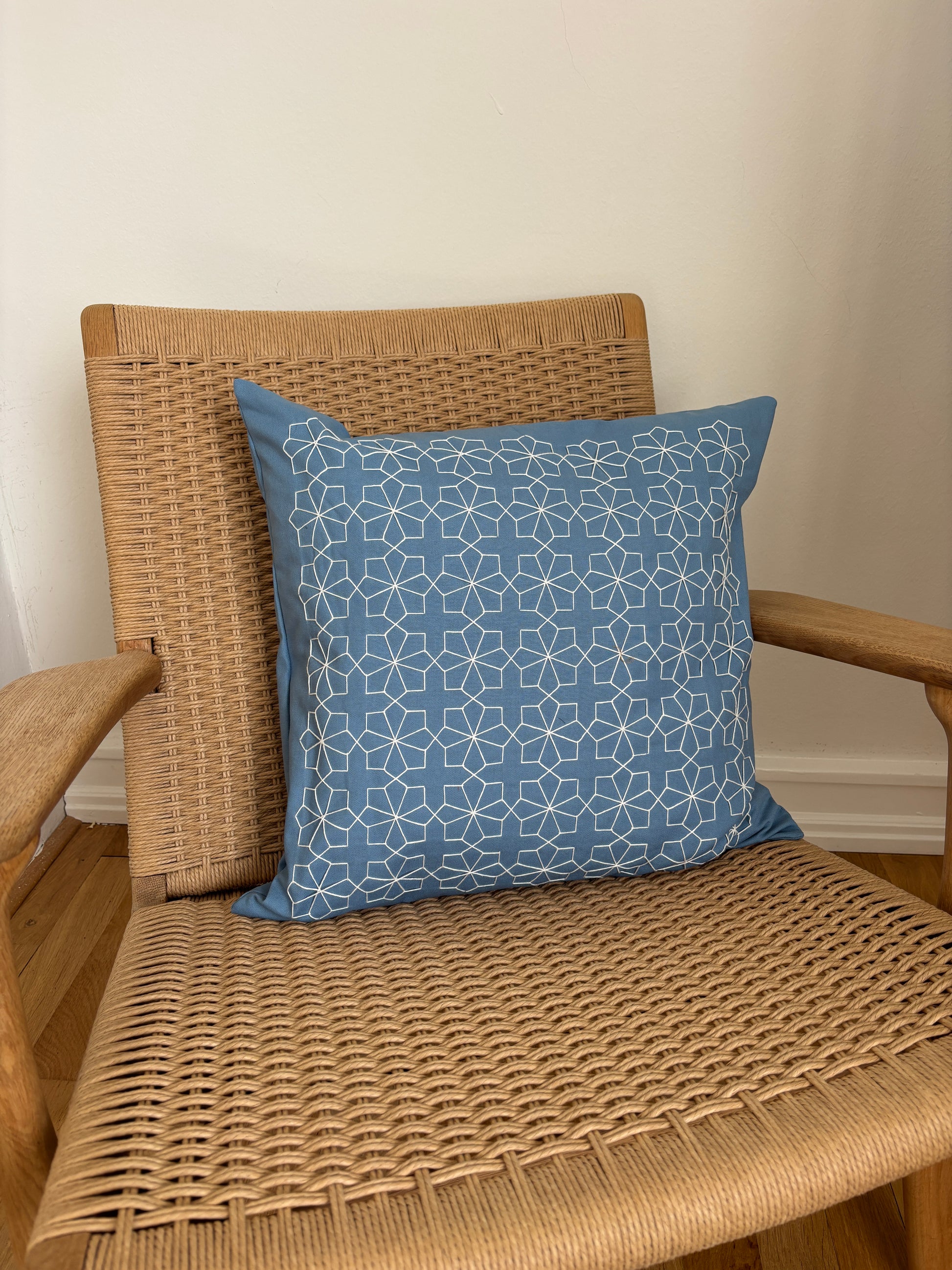 Pude i 100% kraftigt økocertificeret bomuldsstof med håndbroderet sashikomønster. Inderpude af dun medfølger.