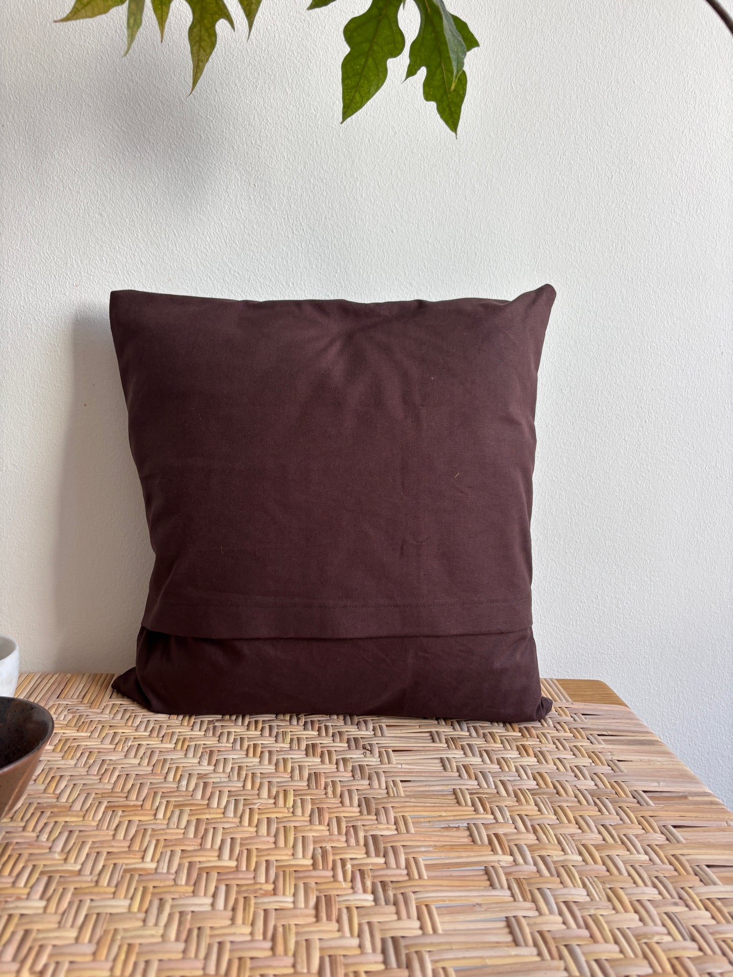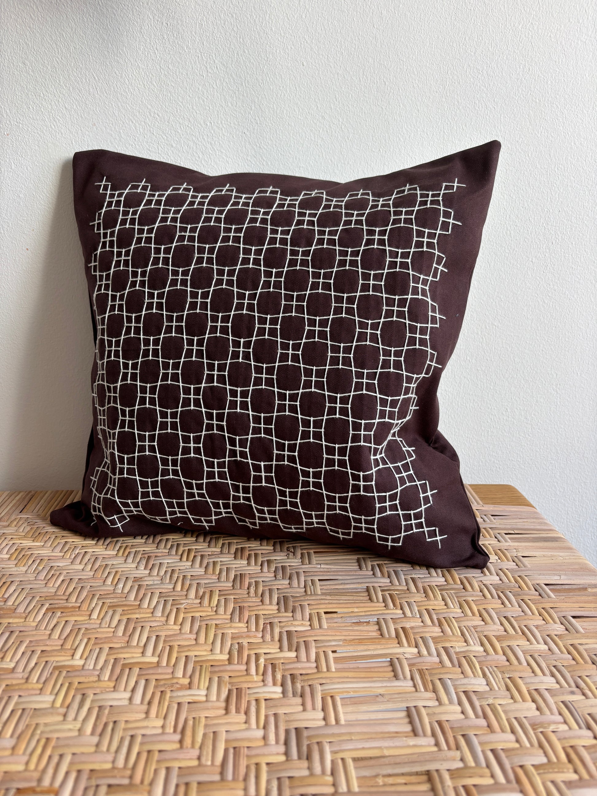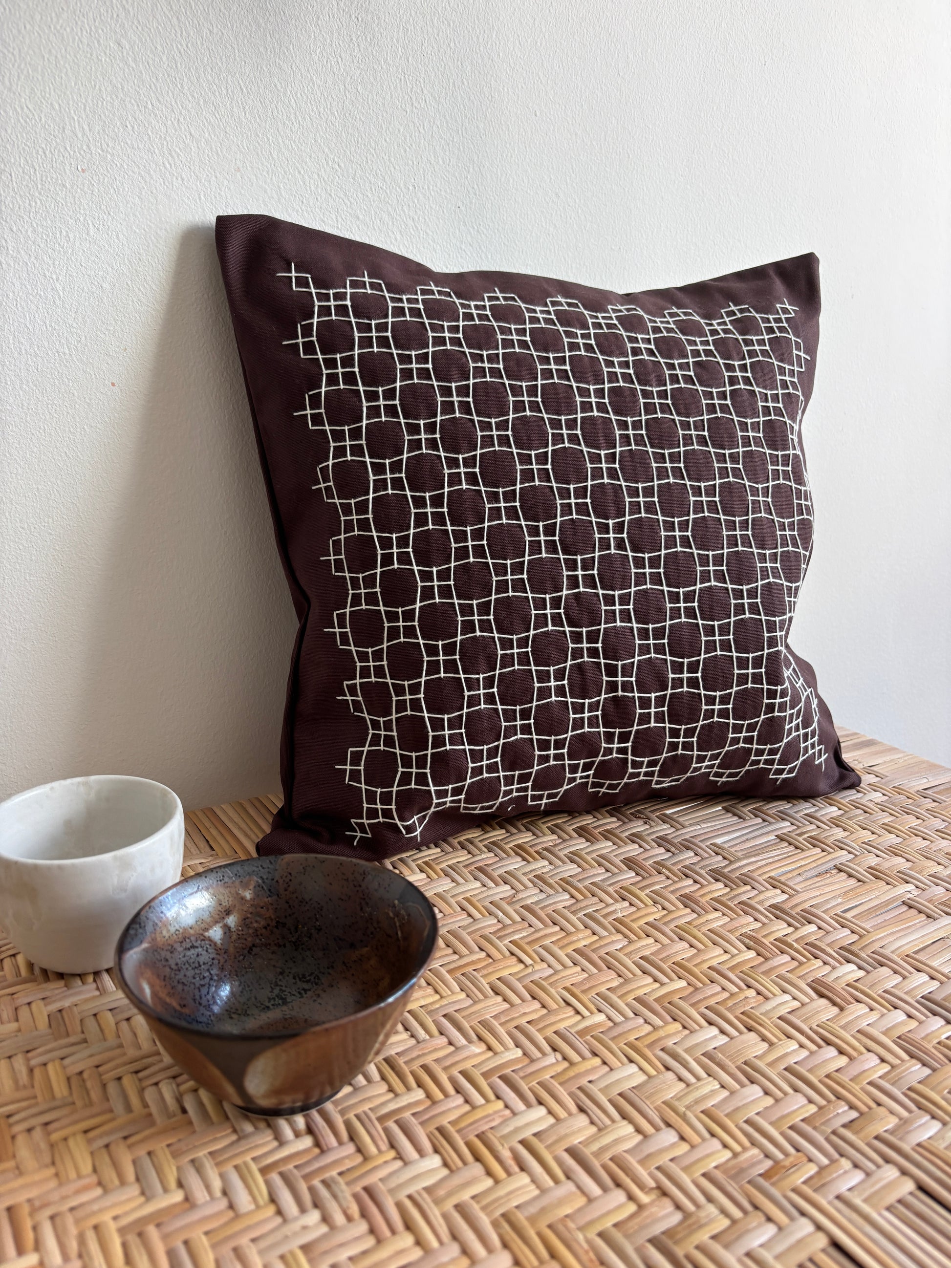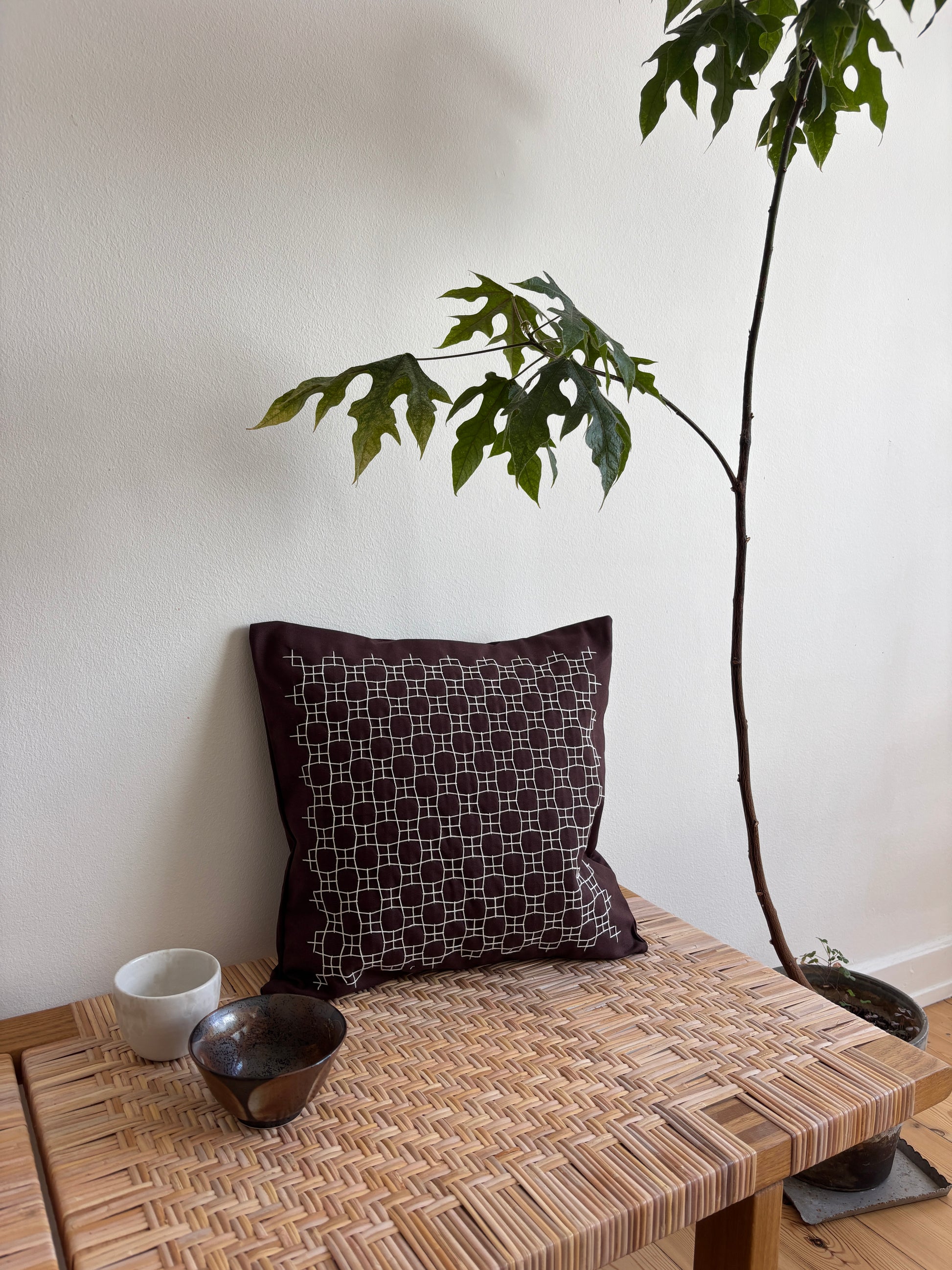 Pude i 100% kraftigt økocertificeret bomuldsstof med håndbroderet sashikomønster. Inderpude af dun medfølger.