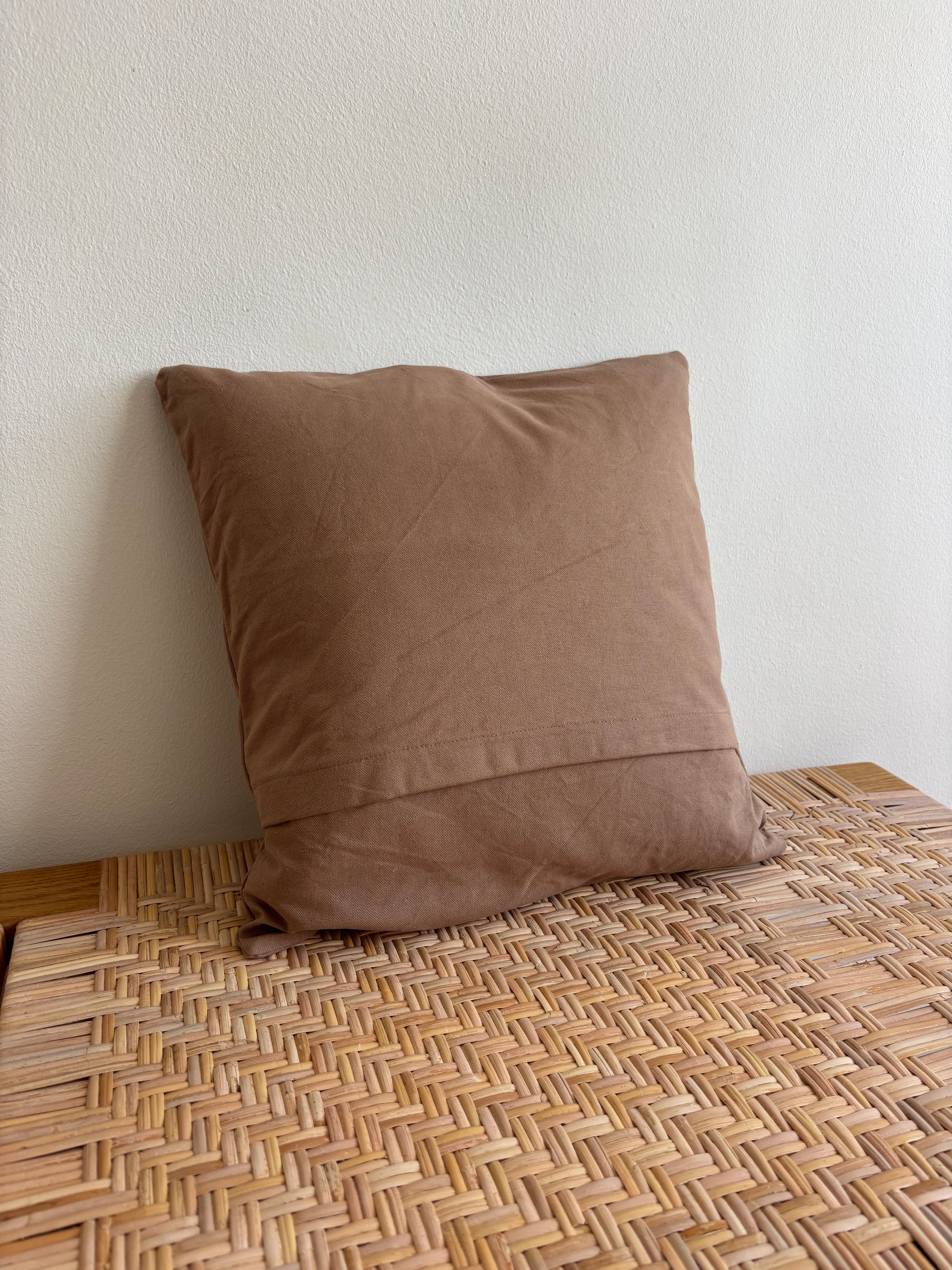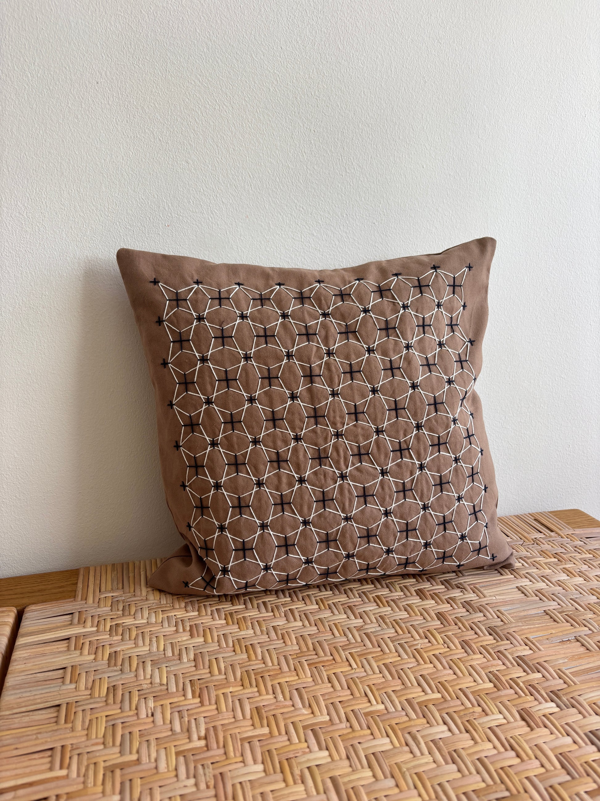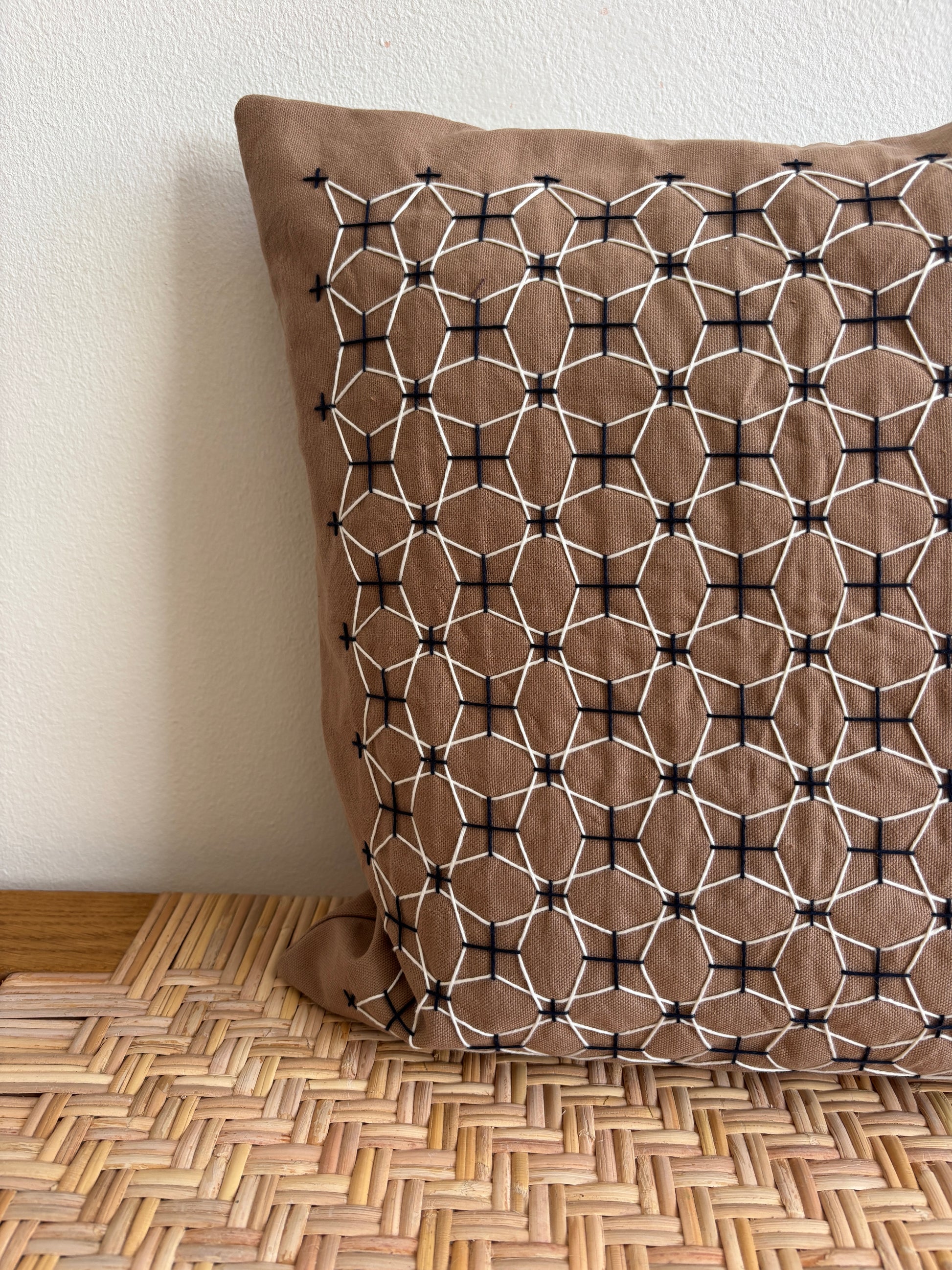 Pude i 100% kraftigt økocertificeret bomuldsstof med håndbroderet sashikomønster. Inderpude af dun medfølger.