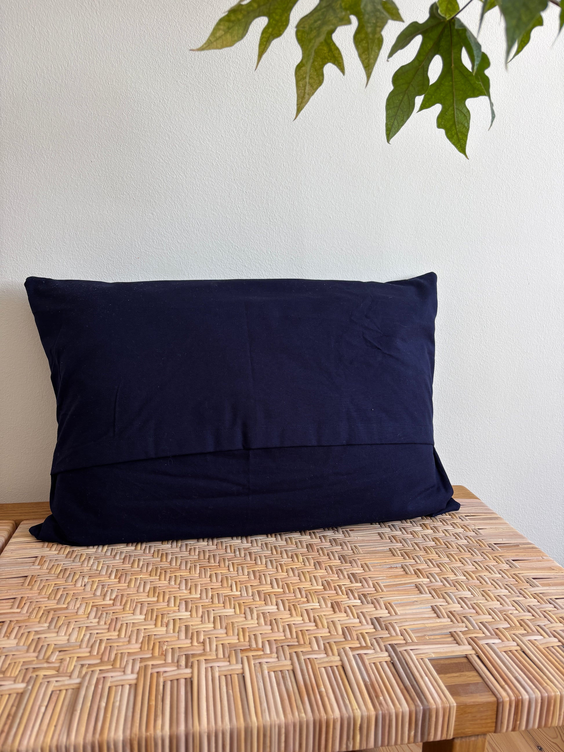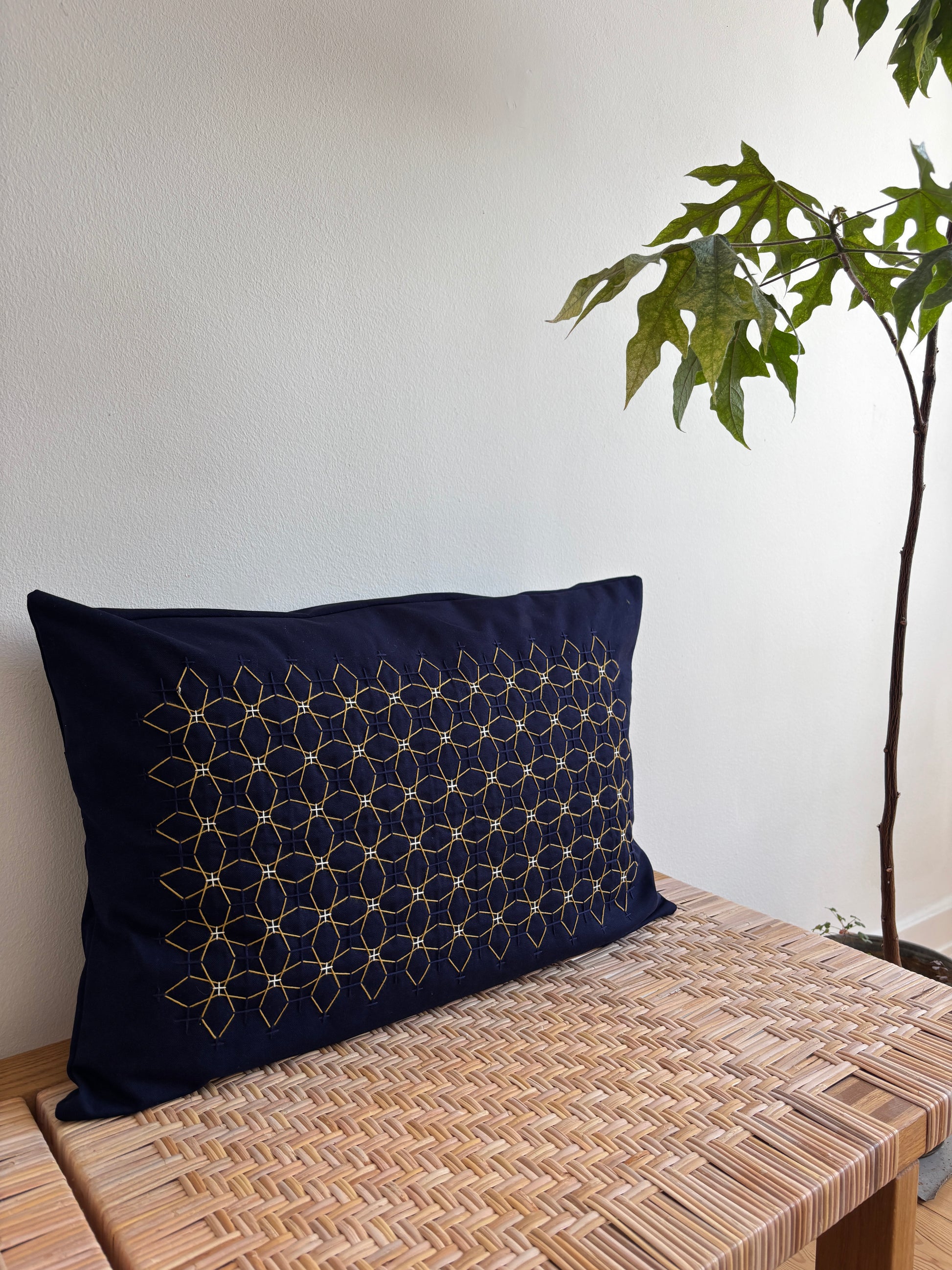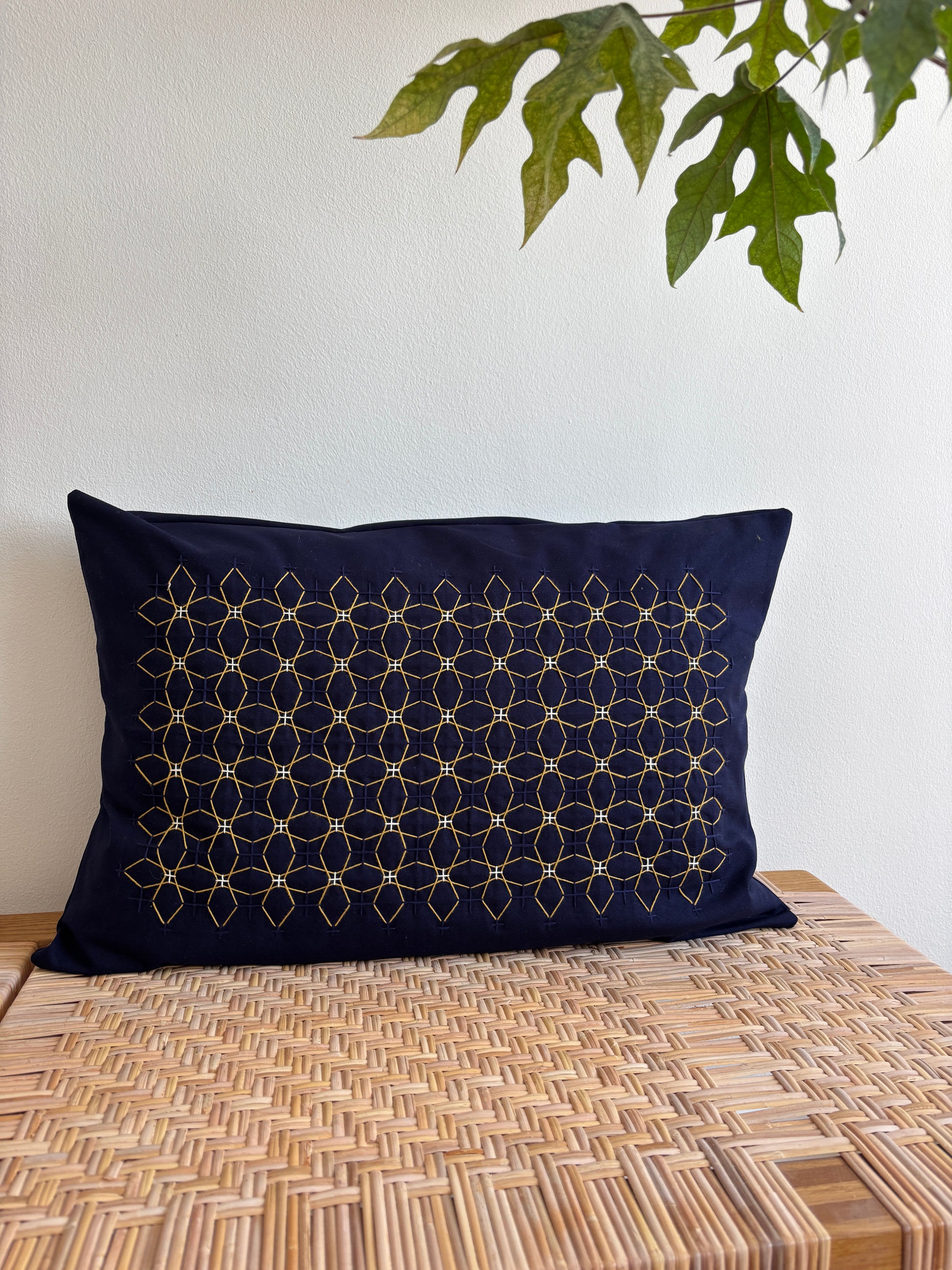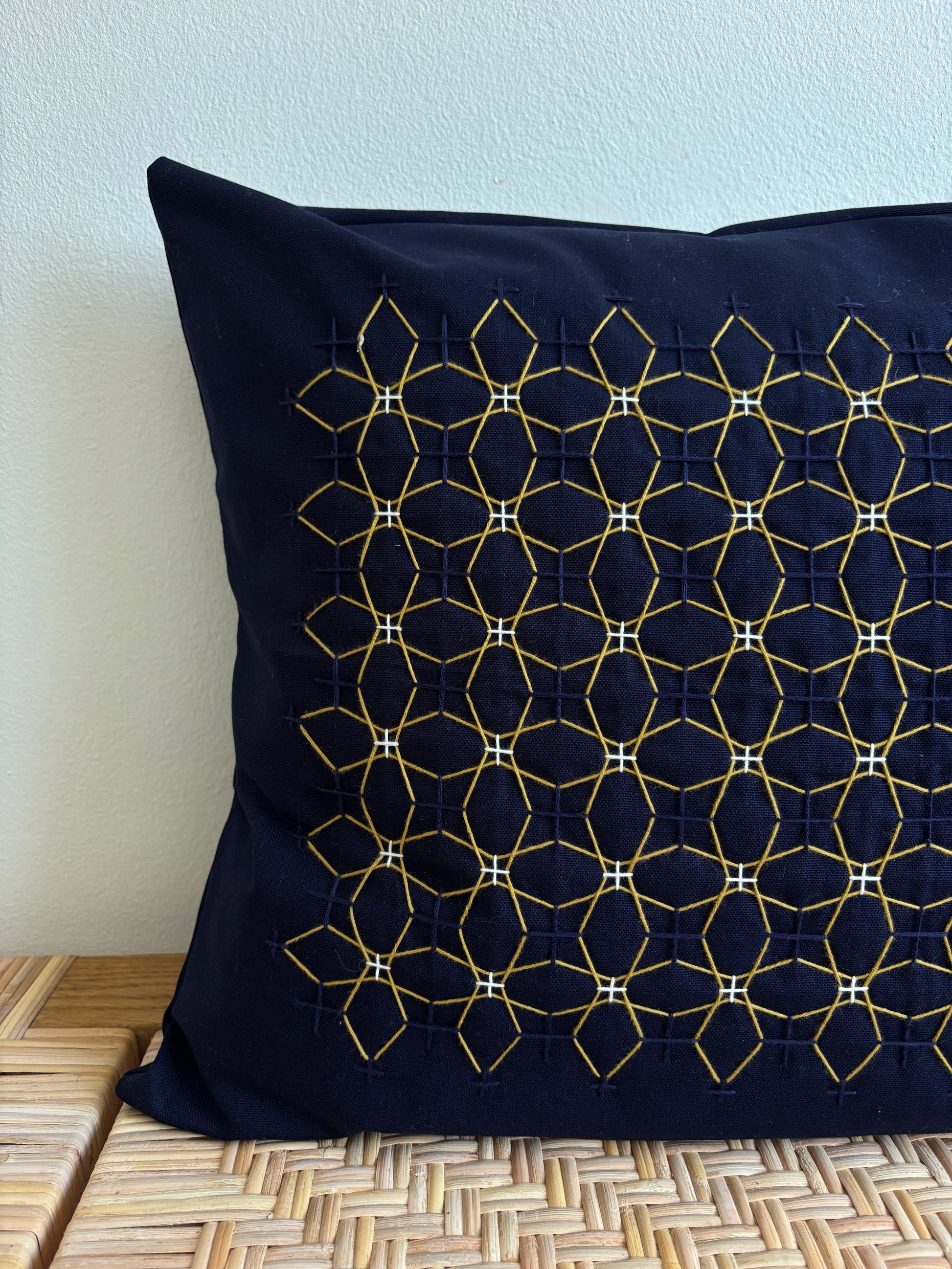 Pude i 100% kraftigt økocertificeret bomuldsstof med håndbroderet sashikomønster. Inderpude af dun medfølger.