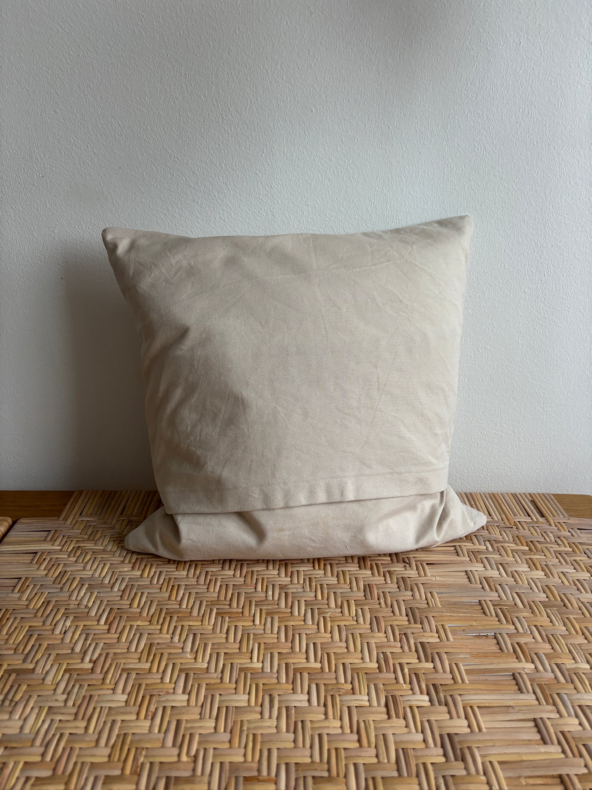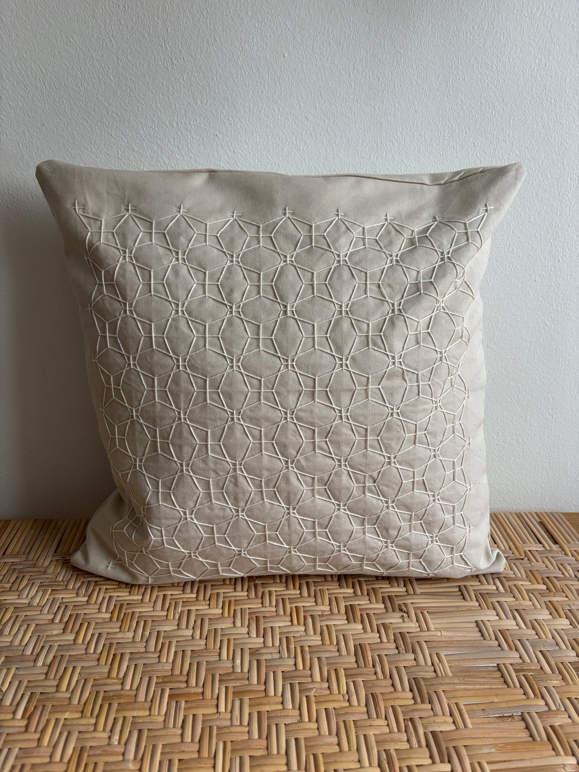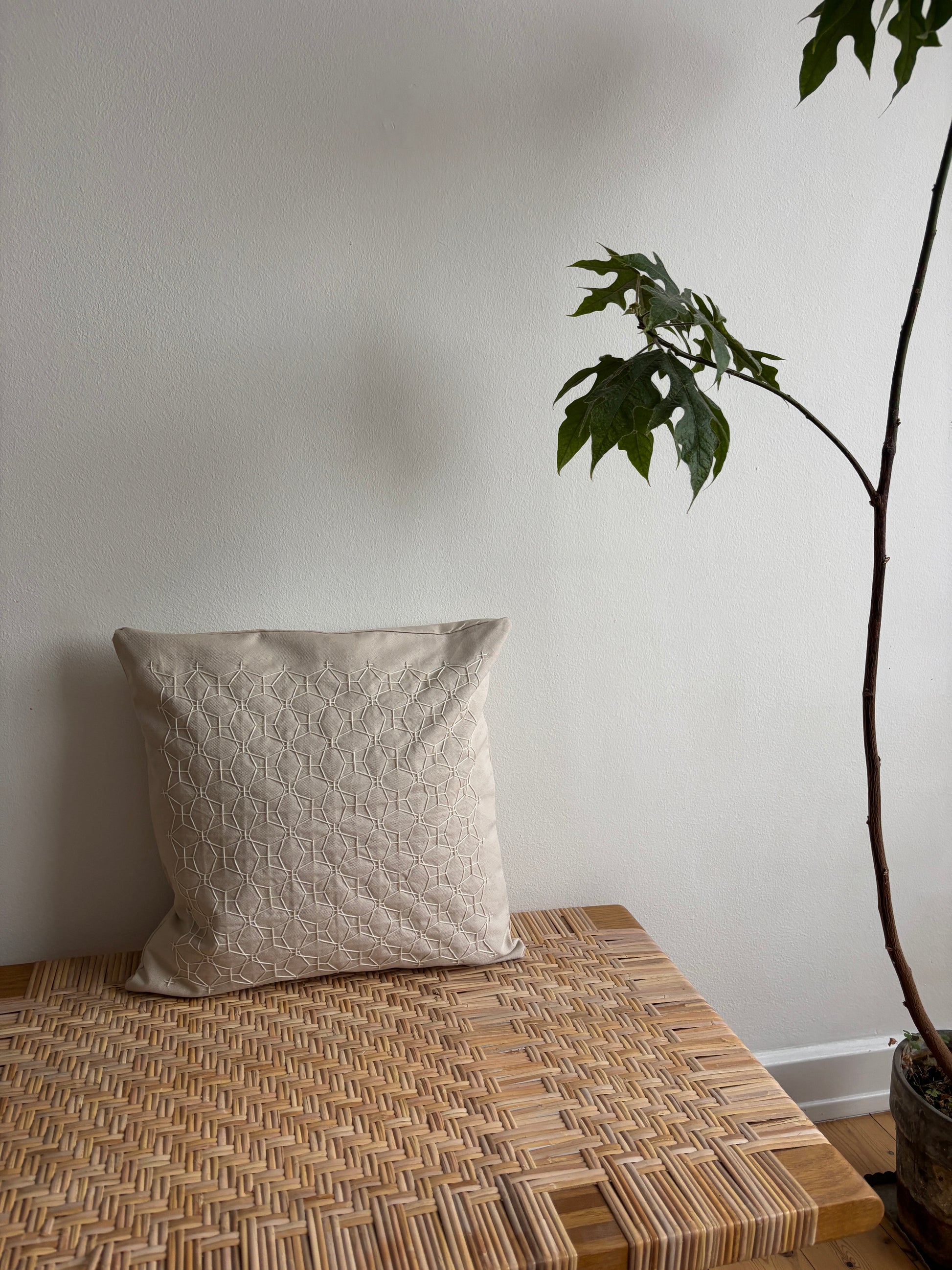 Pude i 100% kraftigt økocertificeret bomuldsstof med håndbroderet sashikomønster. Inderpude af dun medfølger.