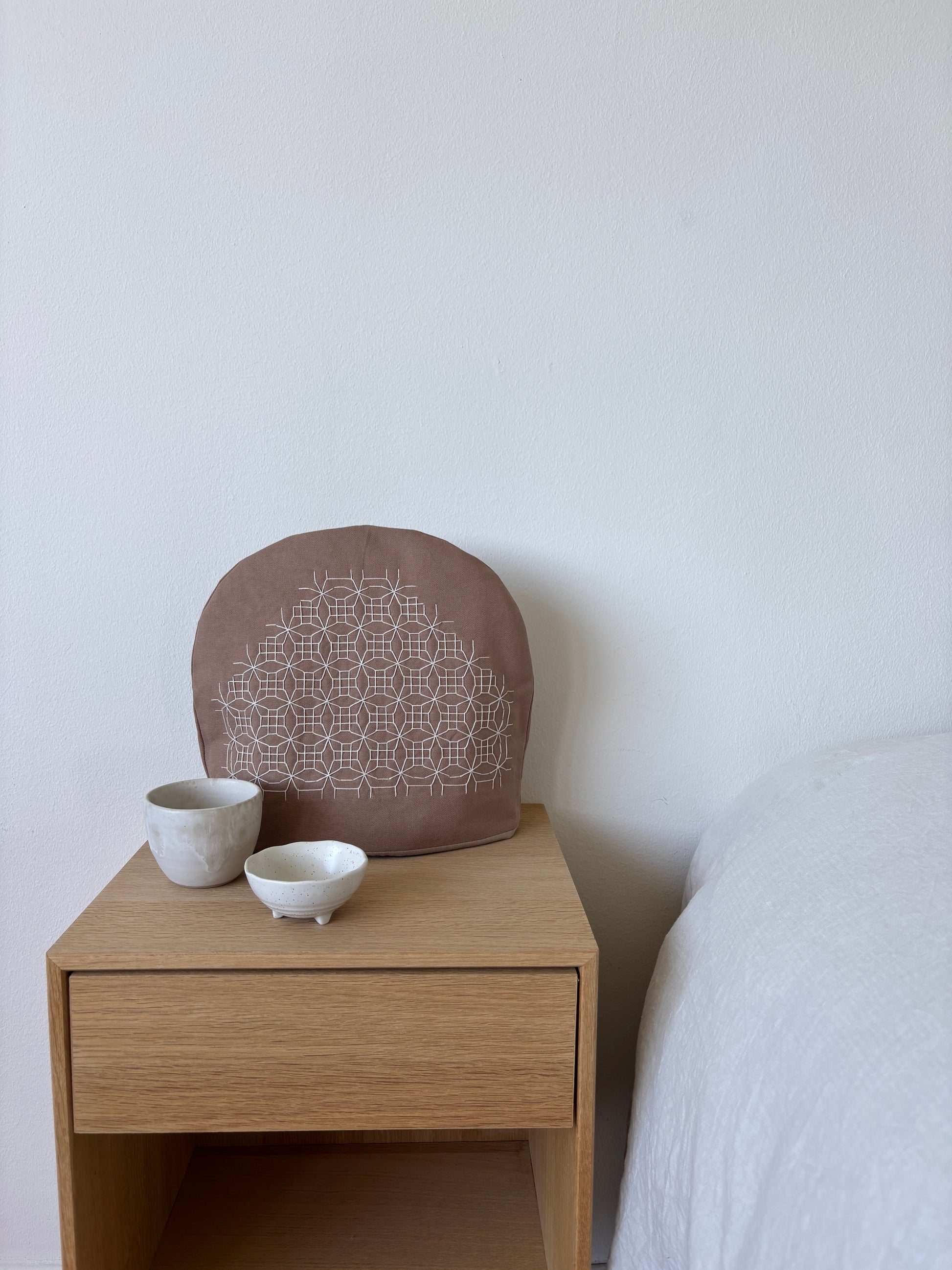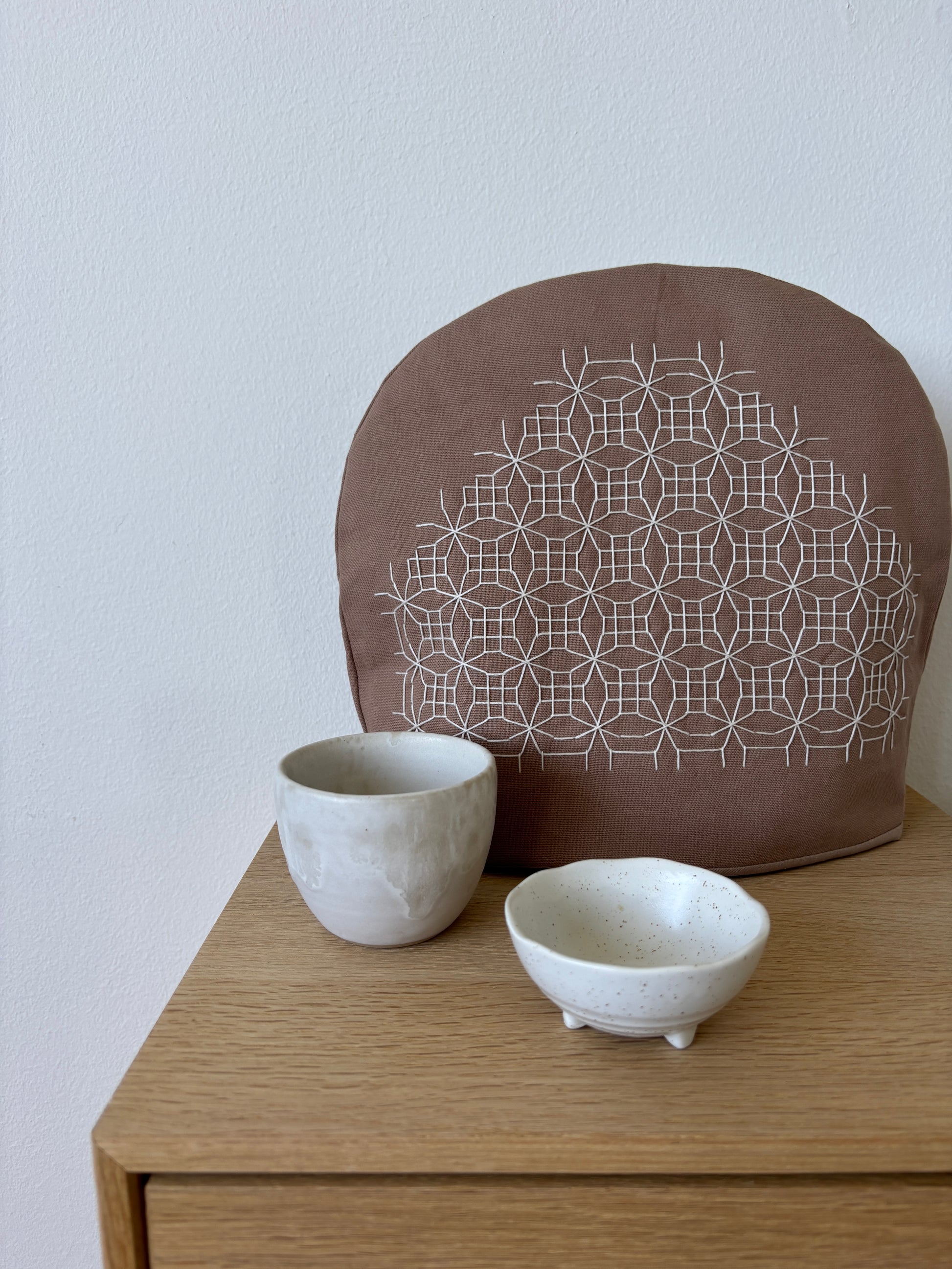 Tehætten er håndbroderet med den japanske sashikoteknik af bomuldsgarn på 100% økocertificetet bomuldsstof.