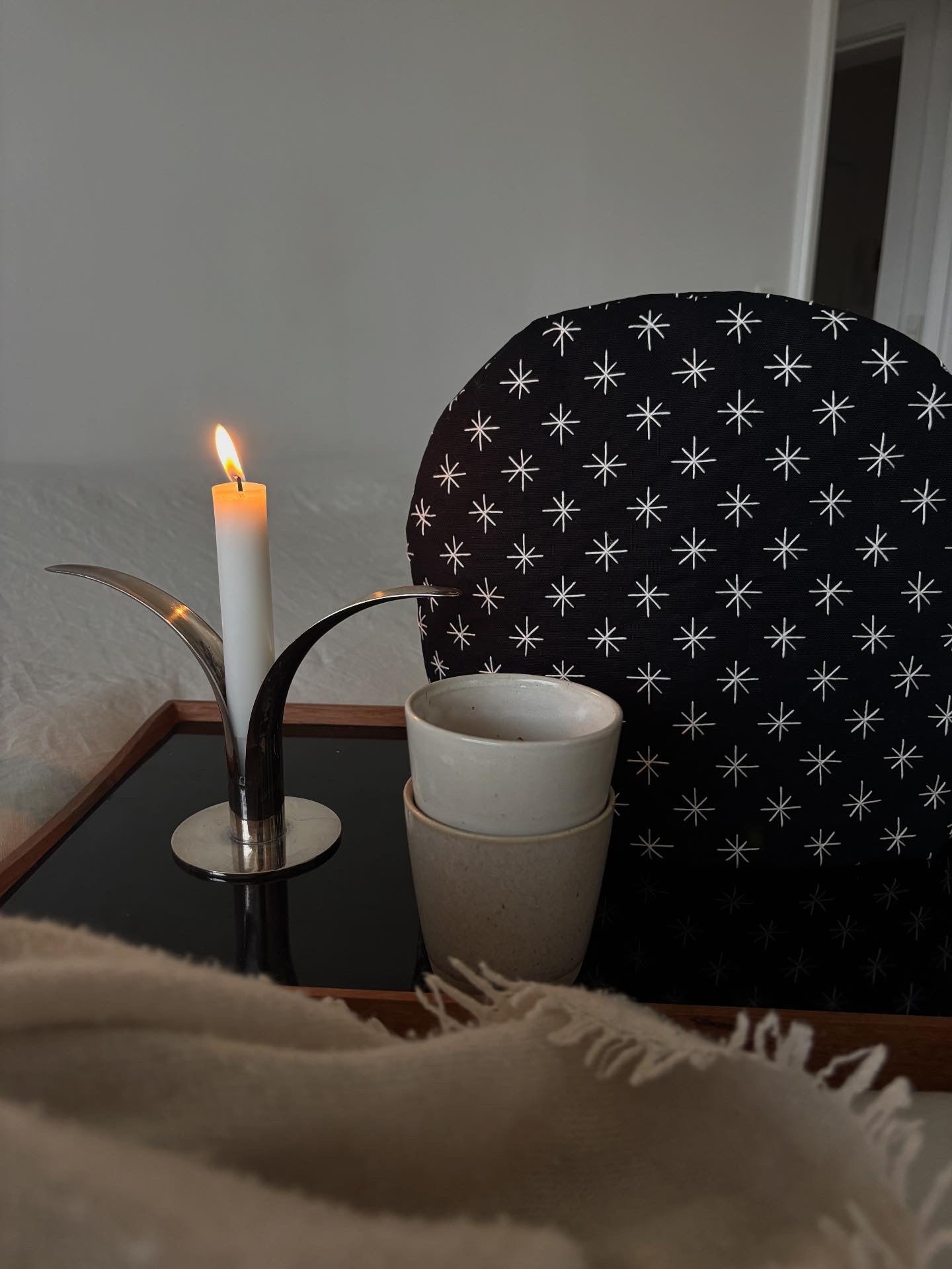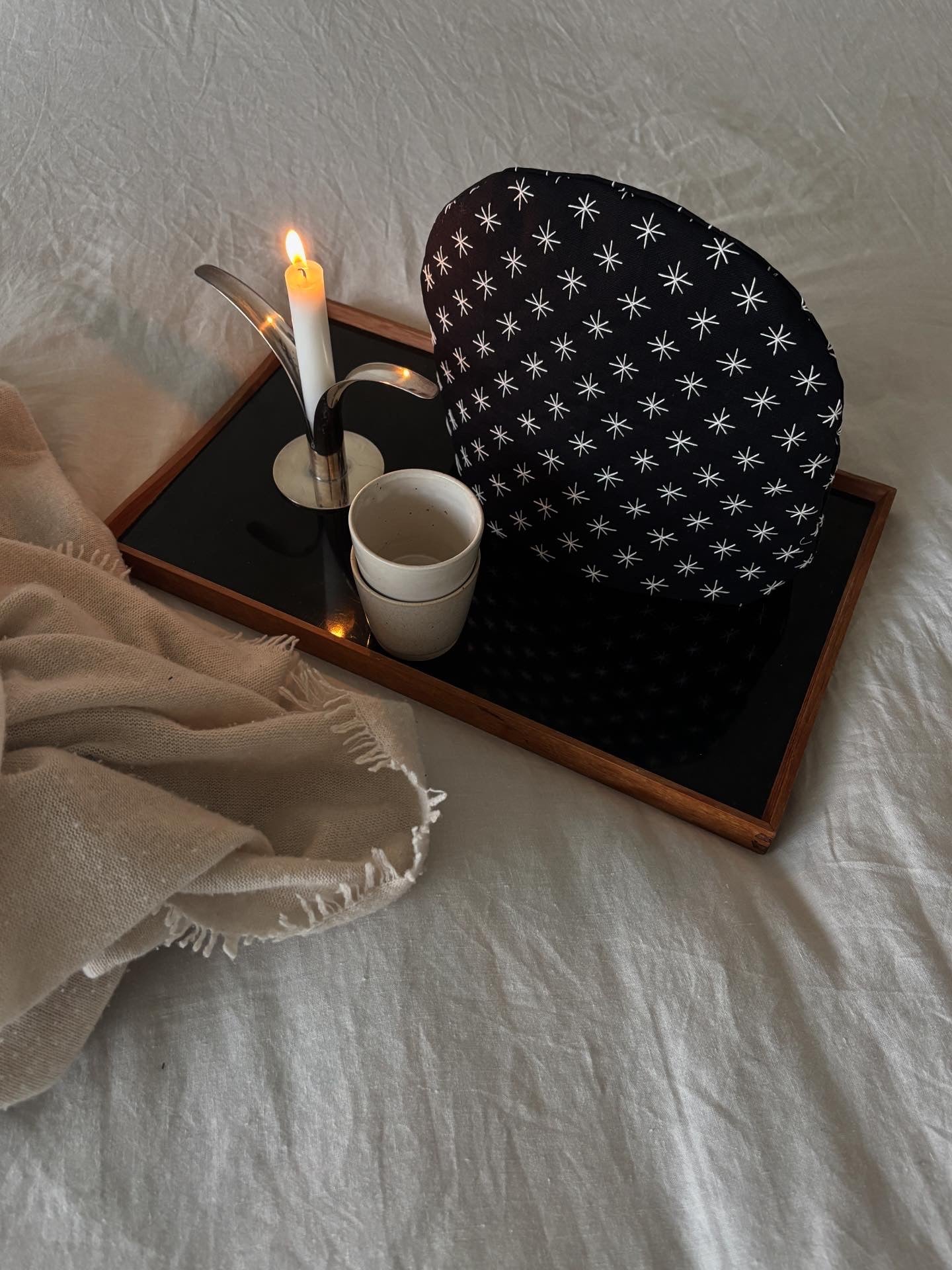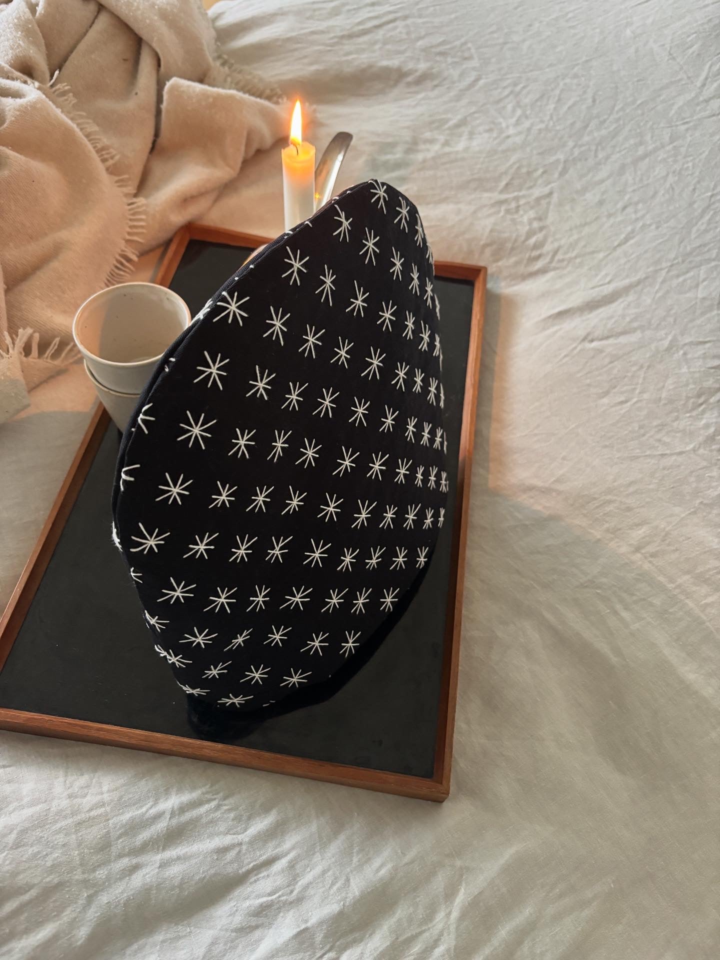 Tehætten er håndbroderet med den japanske sashikoteknik af bomuldsgarn på 100% økocertificetet bomuldsstof.