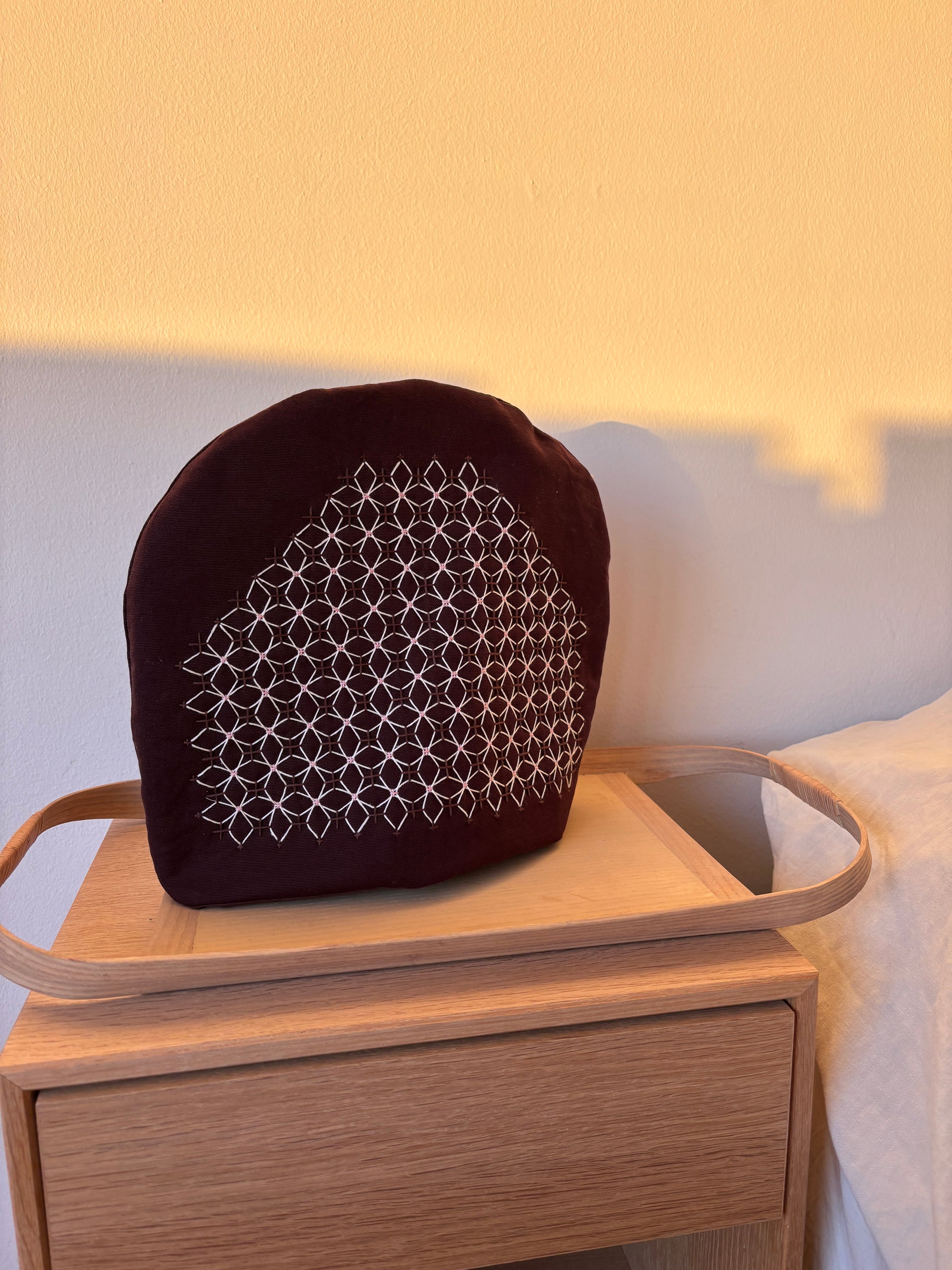 Tehætten er håndbroderet med den japanske sashikoteknik af bomuldsgarn på 100% økocertificetet bomuldsstof.