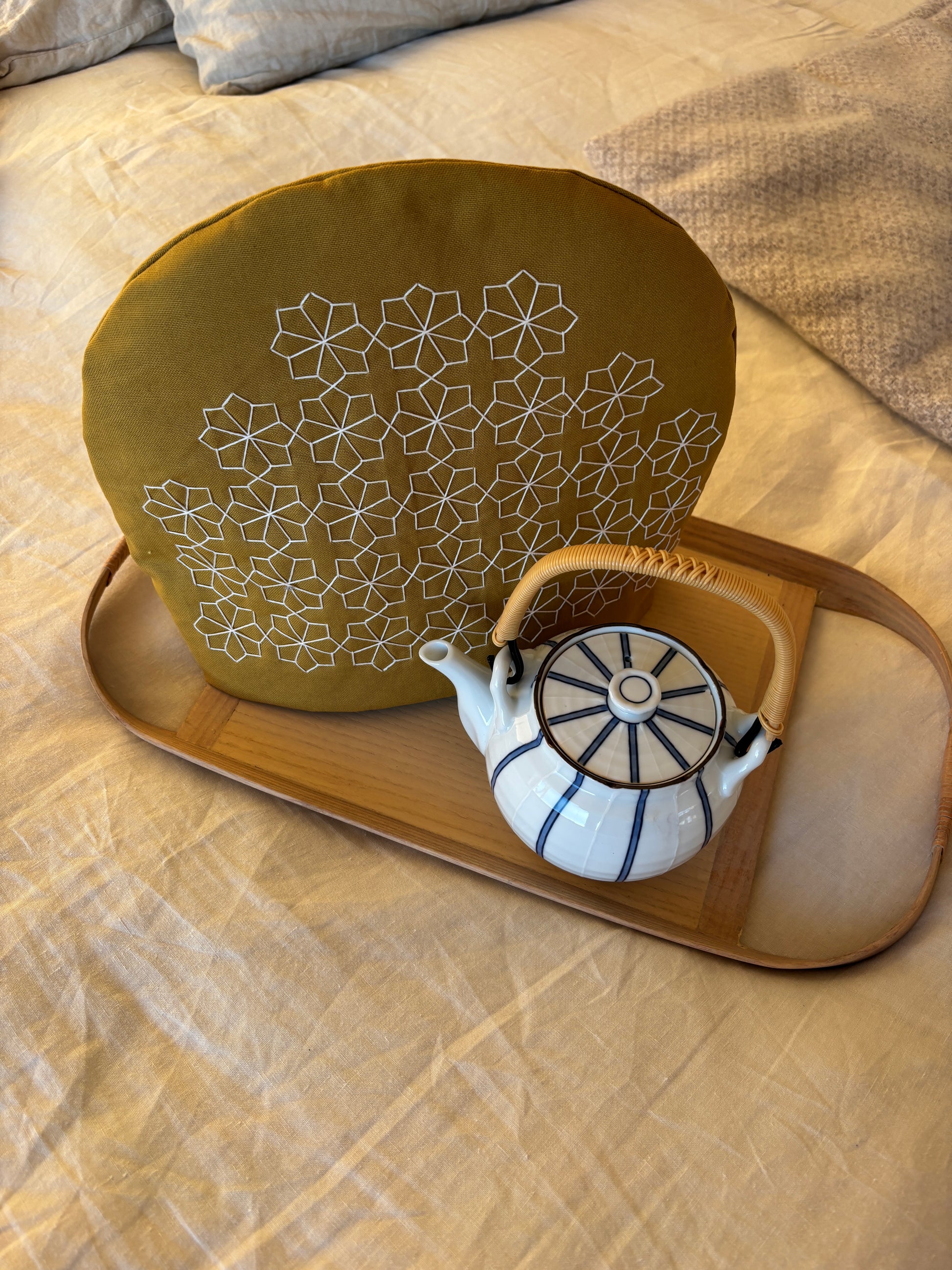 Tehætten er håndbroderet med den japanske sashikoteknik af bomuldsgarn på 100% økocertificetet bomuldsstof.
