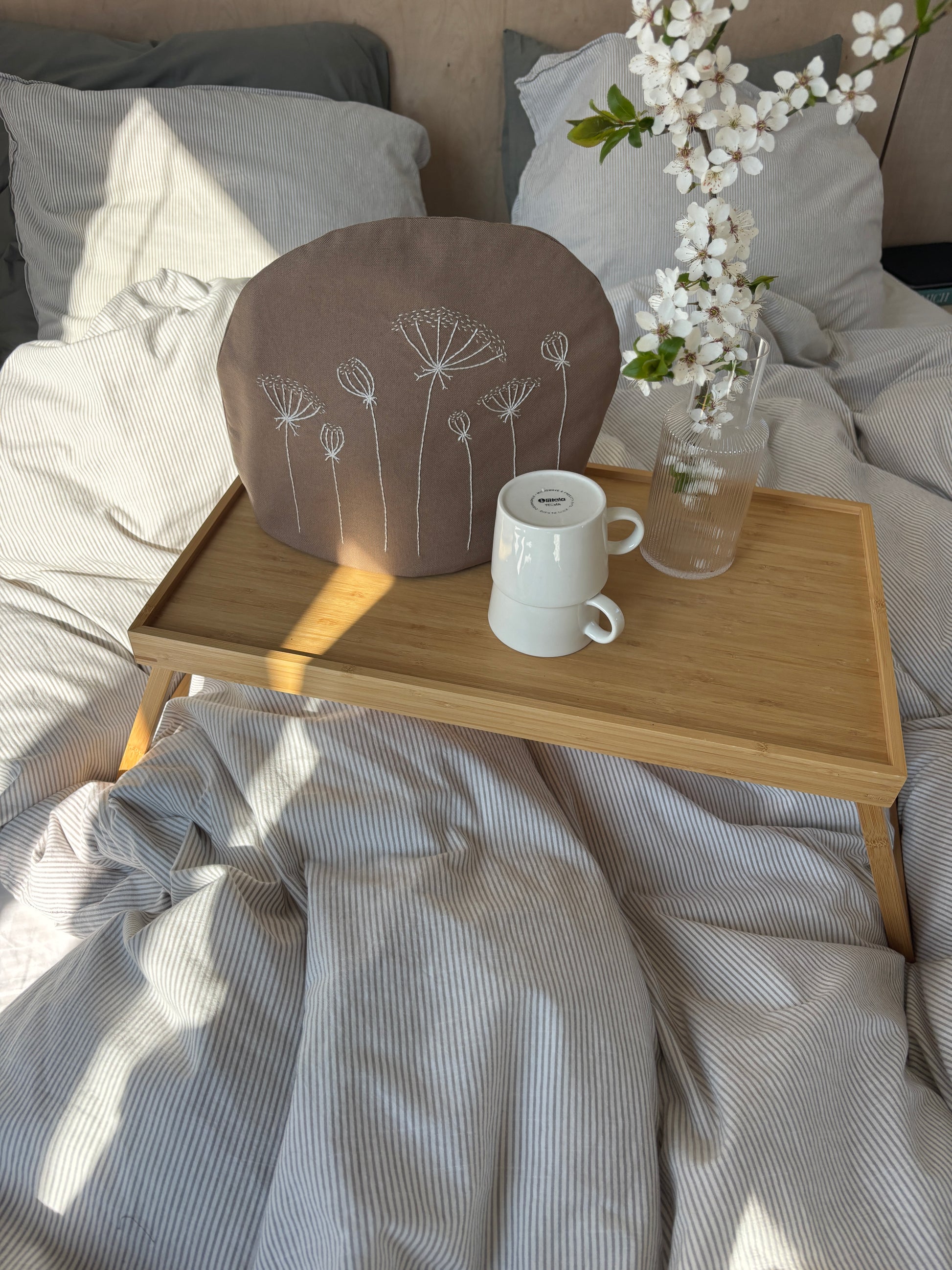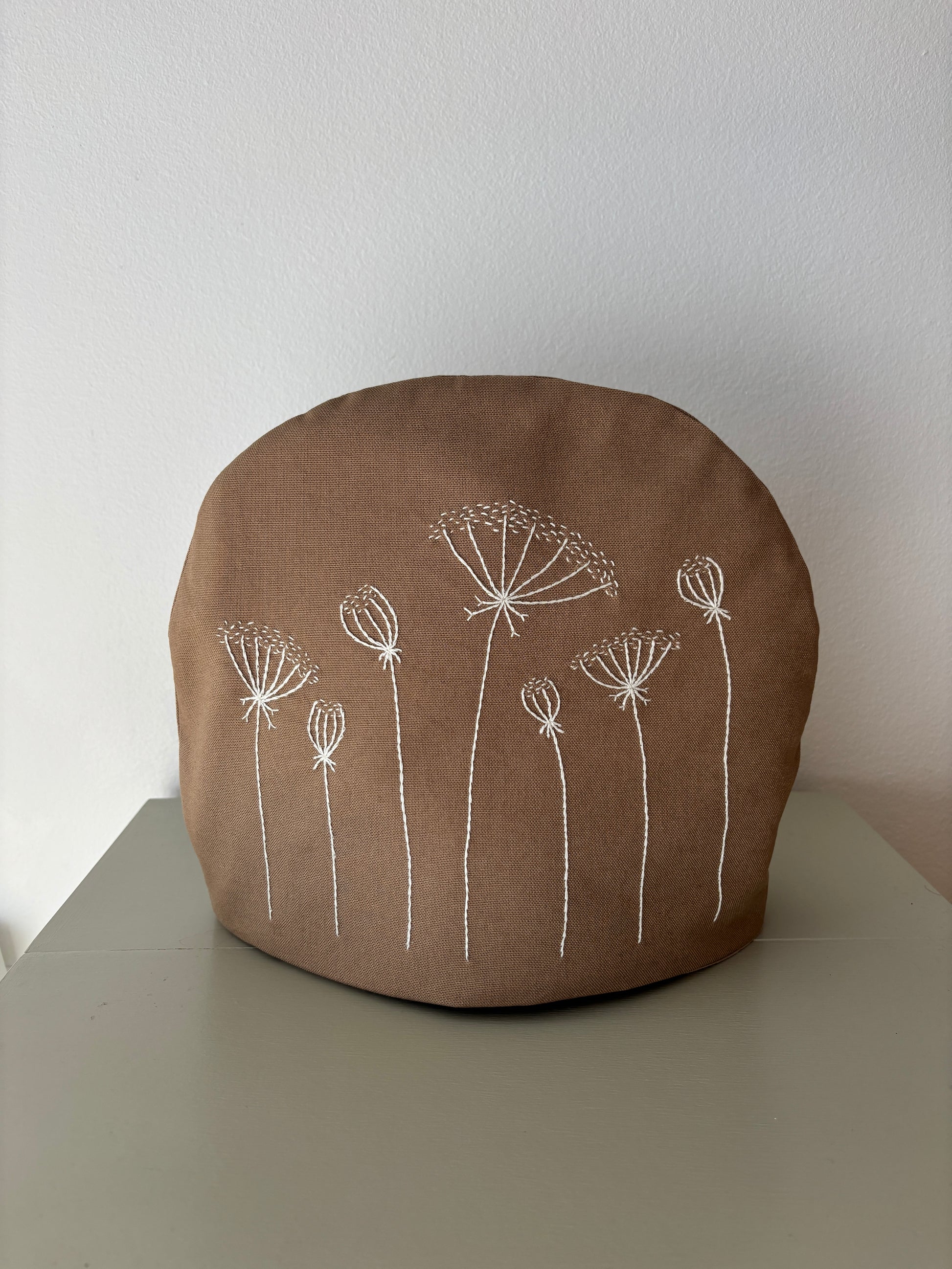 Tehætten er frihåndsbroderet med bomuldsgarn på 100% økocertificetet bomuldsstof.